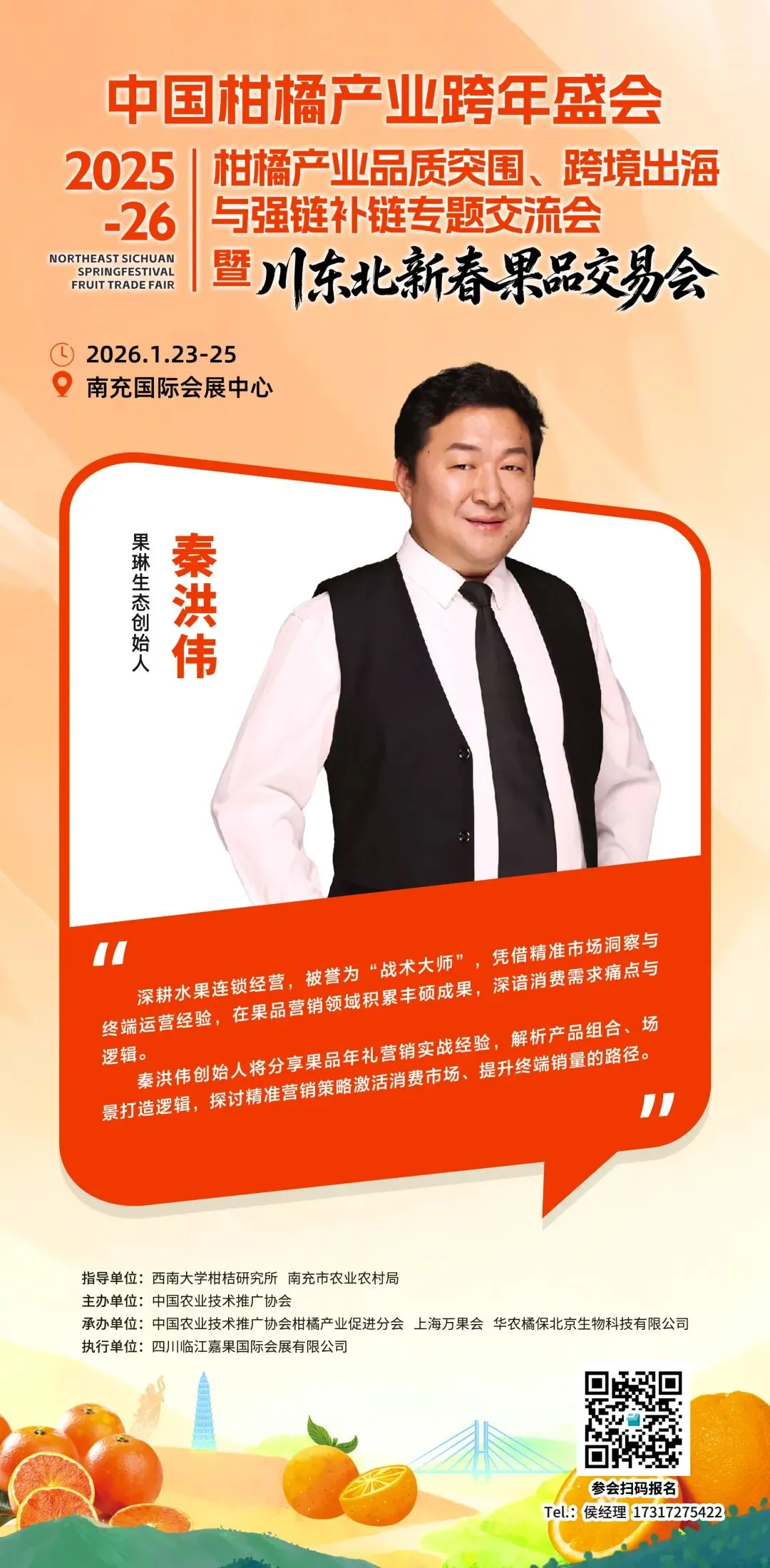 1月23日至25日,备受瞩目的柑橘产业专题交流会暨川东北新春果品交易会即将启幕。作为深耕水果行业14年的领军力量,果琳生态将携全产业链服务能力重磅参展,创始人秦洪伟更将以特邀嘉宾身份登台分享,解密果品营销增长密码,为川东北柑橘产业高质量发展注入新动能。