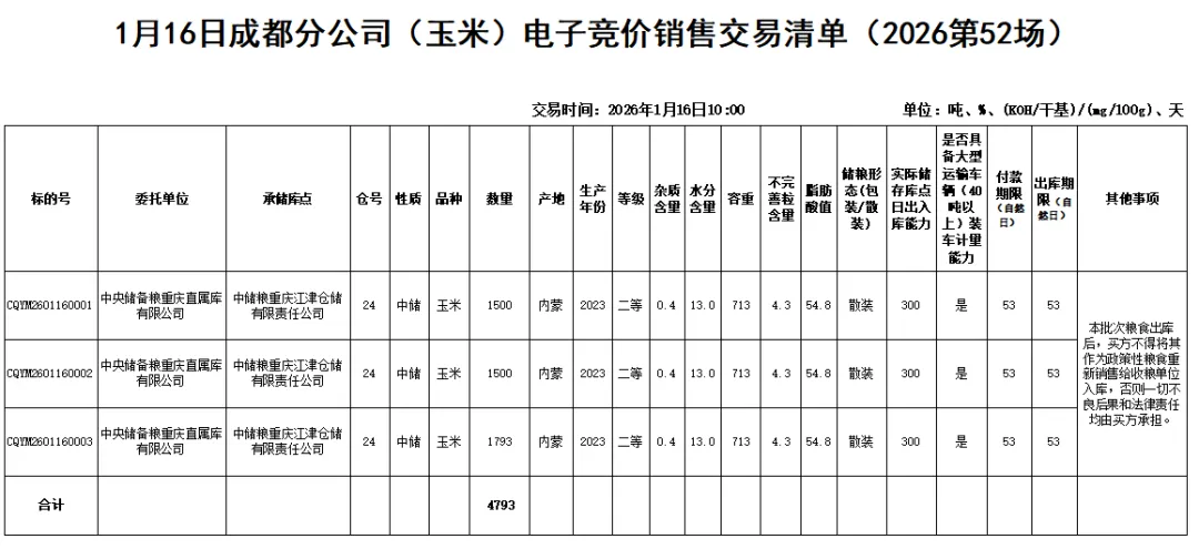 受中国储备粮管理集团有限公司成都分公司委托,重庆市粮油批发市场有限责任公司(即国家粮食重庆交易中心,以下简称“批发市场公司”)定于2026年1月16日10:00举办成都分公司(玉米)电子竞价销售交易会,现将有关事项公告如下: