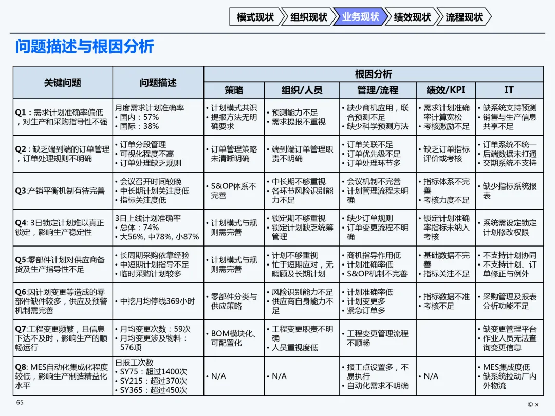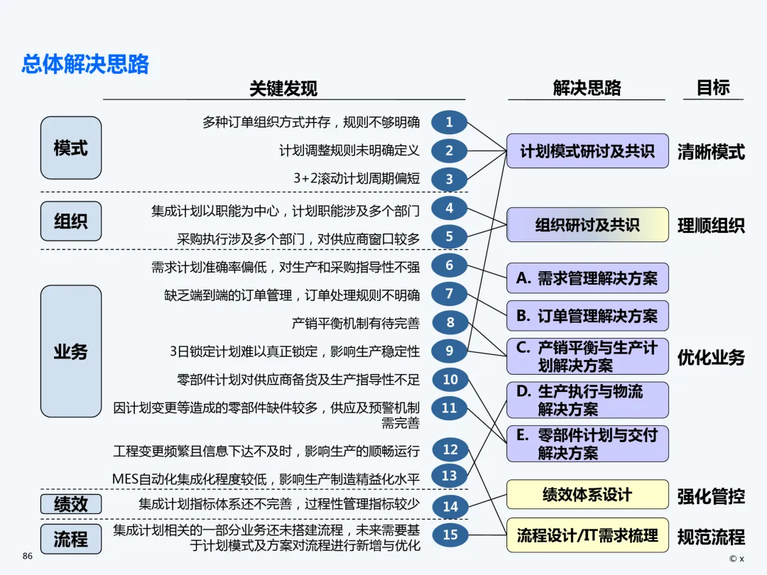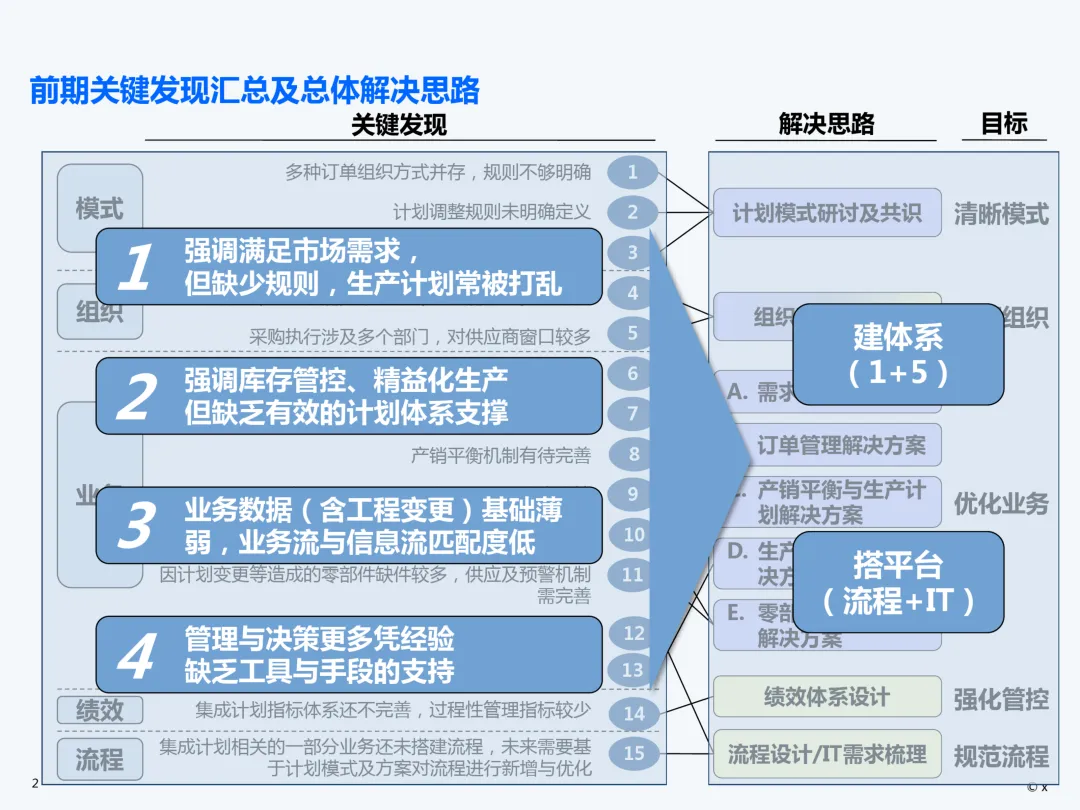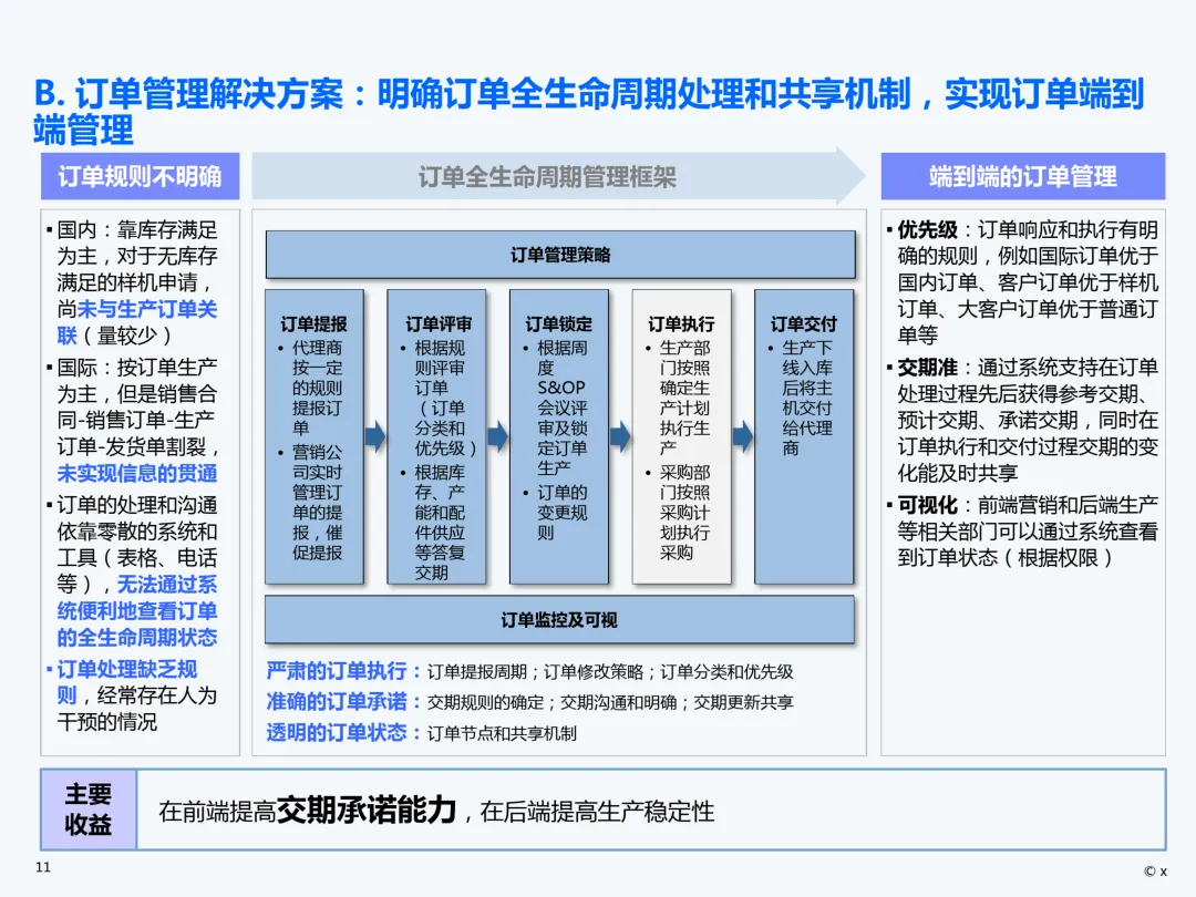 - 效率低下:需求预测依赖经验,定量分析缺失,计划外紧急订单频发;订单管理分段割裂,从销售合同到发货单信息不通贯,可视化程度低;