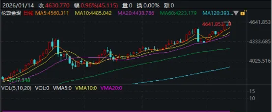 1月14日晚间,伦敦金现价格一度突破4640美元/盎司,再创历史新高。国内市场上,14日上海黄金交易所Au99.99合约价格最高达每克1038.58元,再创历史新高,2026年以来该合约价格累计再涨逾6%。而在此前的2025年,上海黄金交易所Au99.99合约价格全年累计已涨近六成。