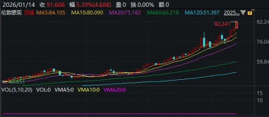 白银价格方面,伦敦银现价格一度突破92美元/盎司,创出历史新高,2026年以来不到10个交易日的时间里累计最大涨幅已超过27%;国内白银期货同样涨势凌厉,沪银期货主力合约价格1月14日再度大涨逾8%,2026年以来累计涨幅也已超过26%。