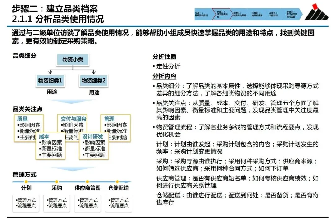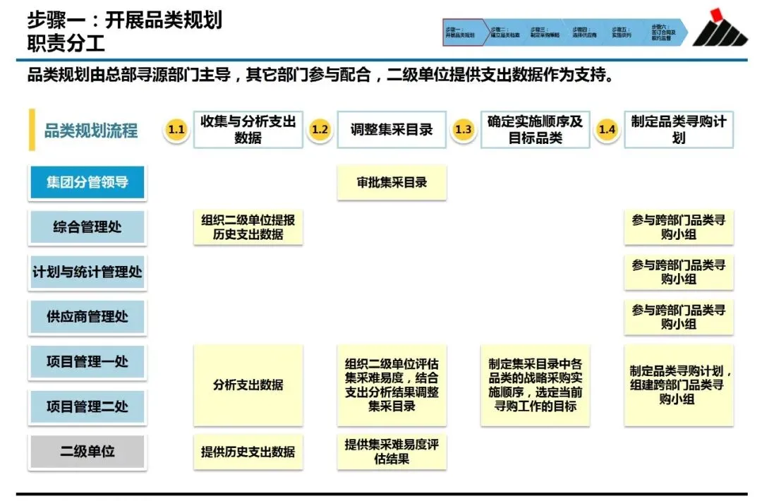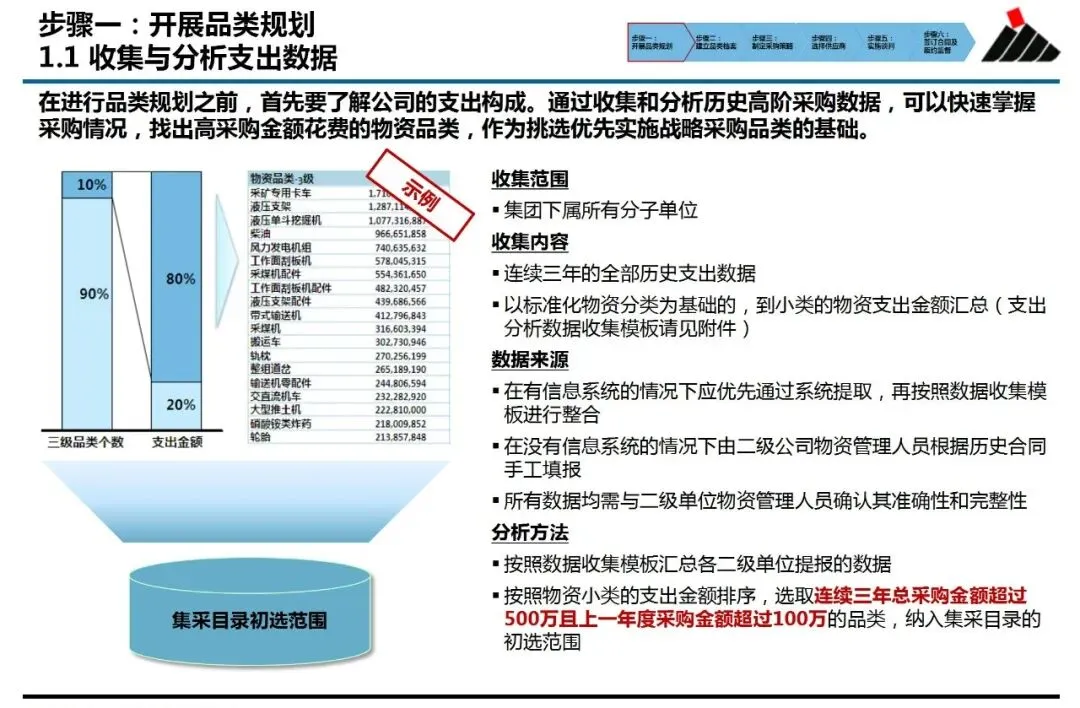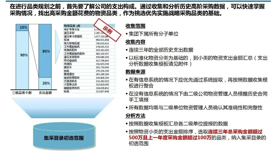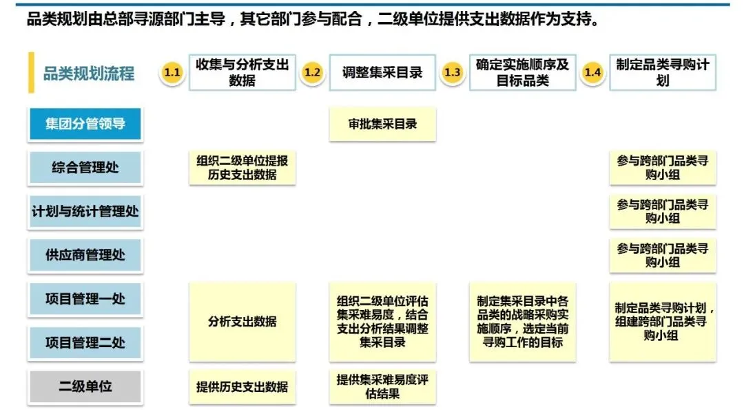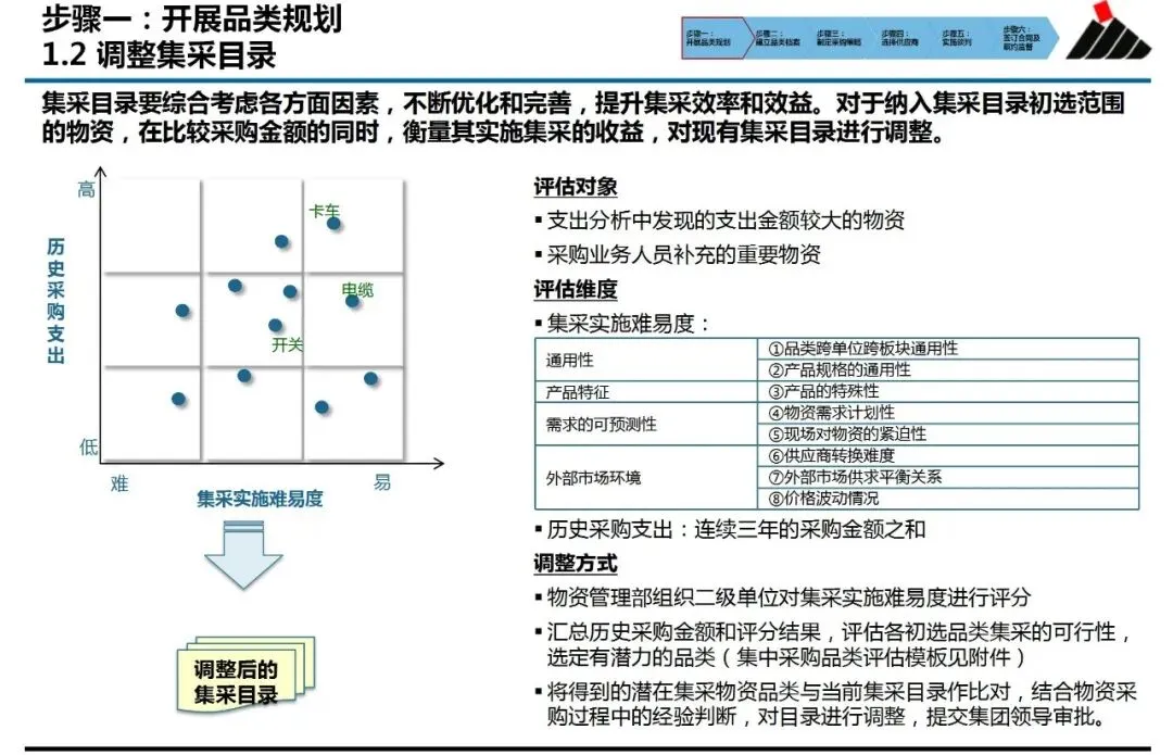 ①品类规划:解决“从哪里开始”的问题。它并非简单罗列物资清单,而是基于连续多年的支出数据分析,结合集采实施的难易度评估,科学筛选出具备高潜力与可行性的目标品类。这确保了有限的采购资源,能精准投入在能产生最大集约化效益的领域,避免了“遍地开花却收效甚微”的困境。
