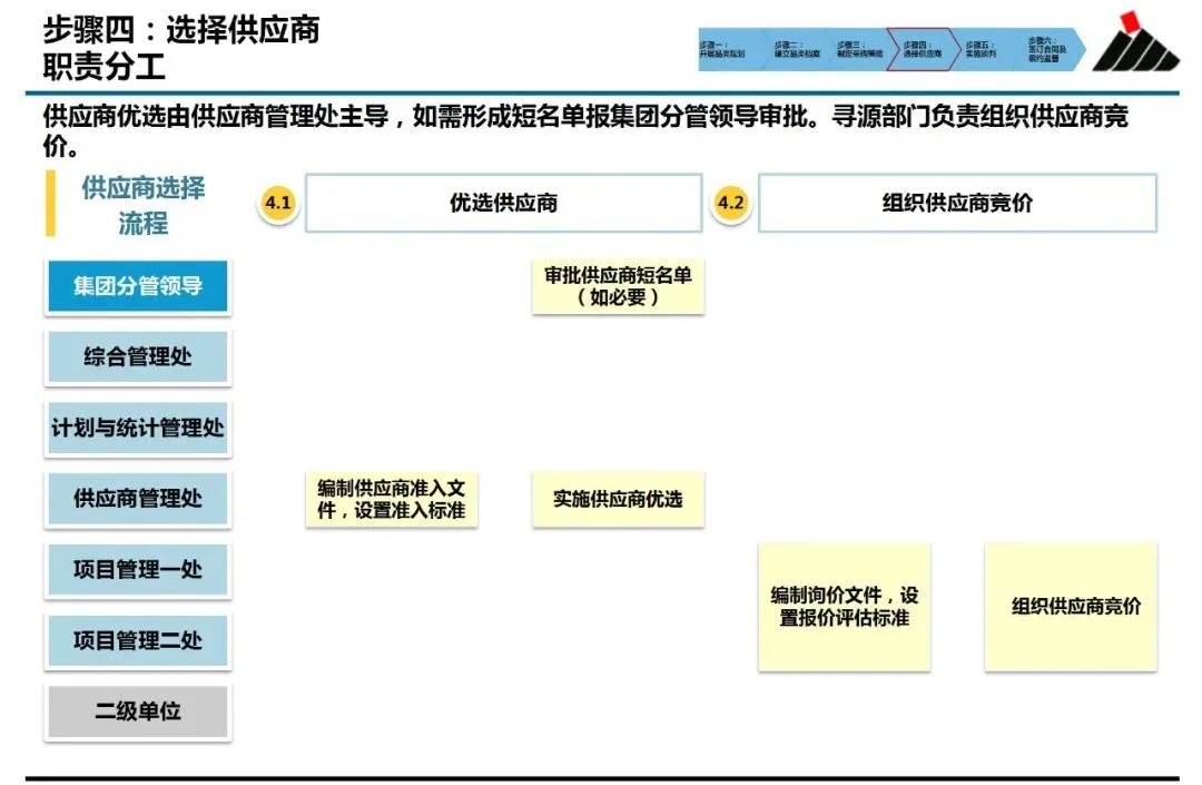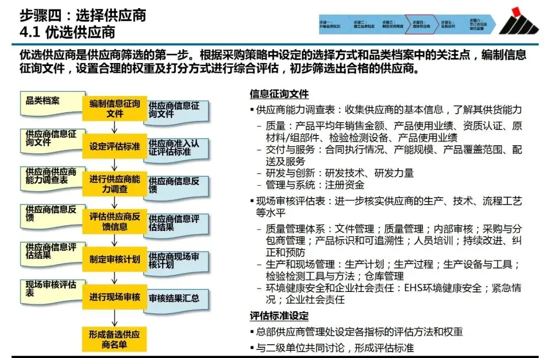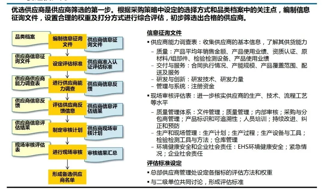 ④选择供应商:从“海选”到“精选”的标准化筛选。该流程明确区分了“优选”与“竞价”两阶段。优选阶段通过标准化的信息征询与评估,过滤掉资质能力不符的供应商,形成“备选名单”。竞价阶段则针对性地发出询价文件,并预设包含价格与非价格因素(如服务、付款条件)的评估模型,确保最终进入谈判的供应商是综合竞争力最强的,而非仅仅是报价最低的。
