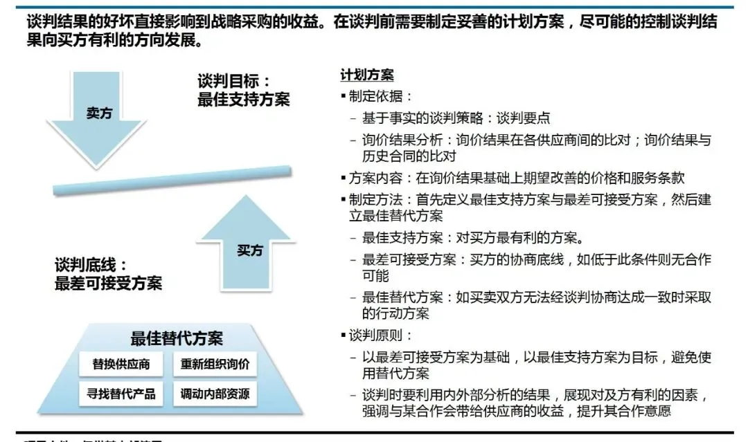 ⑤实施谈判:基于事实的专业协商,而非单纯压价。规则强调谈判是“基于事实的协商”。谈判前,需制定详尽的计划,明确最佳目标、底线以及替代方案。谈判中,设置不同角色(负责人、主持人、内外部专家),依据前期市场分析和报价分析,与供应商进行专业沟通。其目标不是单方面胜出,而是在充分理解双方立场后,达成一个可持续的最优合作方案。