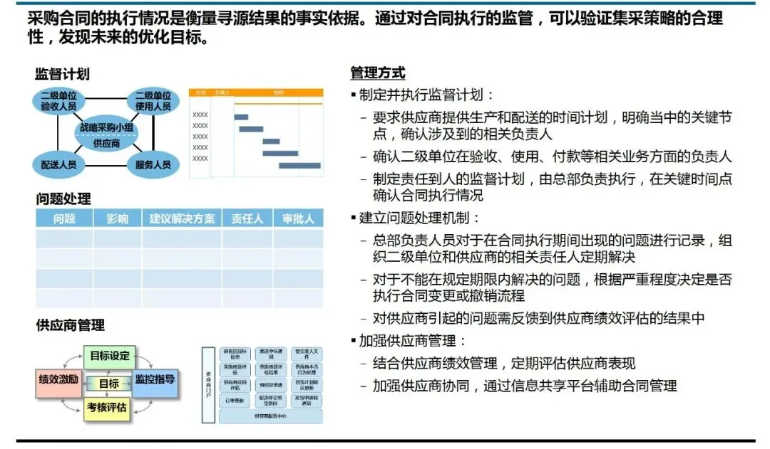 ⑥签订合同及履约监督:确保寻源成果落地与持续优化。寻源的终点不是合同签署,而是合同价值的实现。规则要求制定统一的合同模板,并建立覆盖执行关键节点的监督计划与问题处理机制。将履约情况反馈至供应商绩效评估,形成管理闭环,使得每一次寻源的成果和经验,都能滋养后续的供应商关系与采购决策。