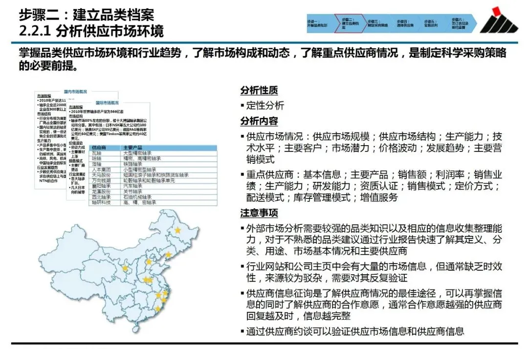 ②建立品类档案:绘制“内部需求与外部市场”的作战地图。这一步通过深入的内部访谈(了解使用情况、管理痛点、特殊需求)和外部市场分析(行业趋势、竞争格局、供应商能力),将定性的经验与定量的数据相结合。尤其是运用“波特五力模型”分析供应市场竞争态势,让采购人员清晰地认识到己方所处的议价地位,为后续策略制定提供了现实依据。