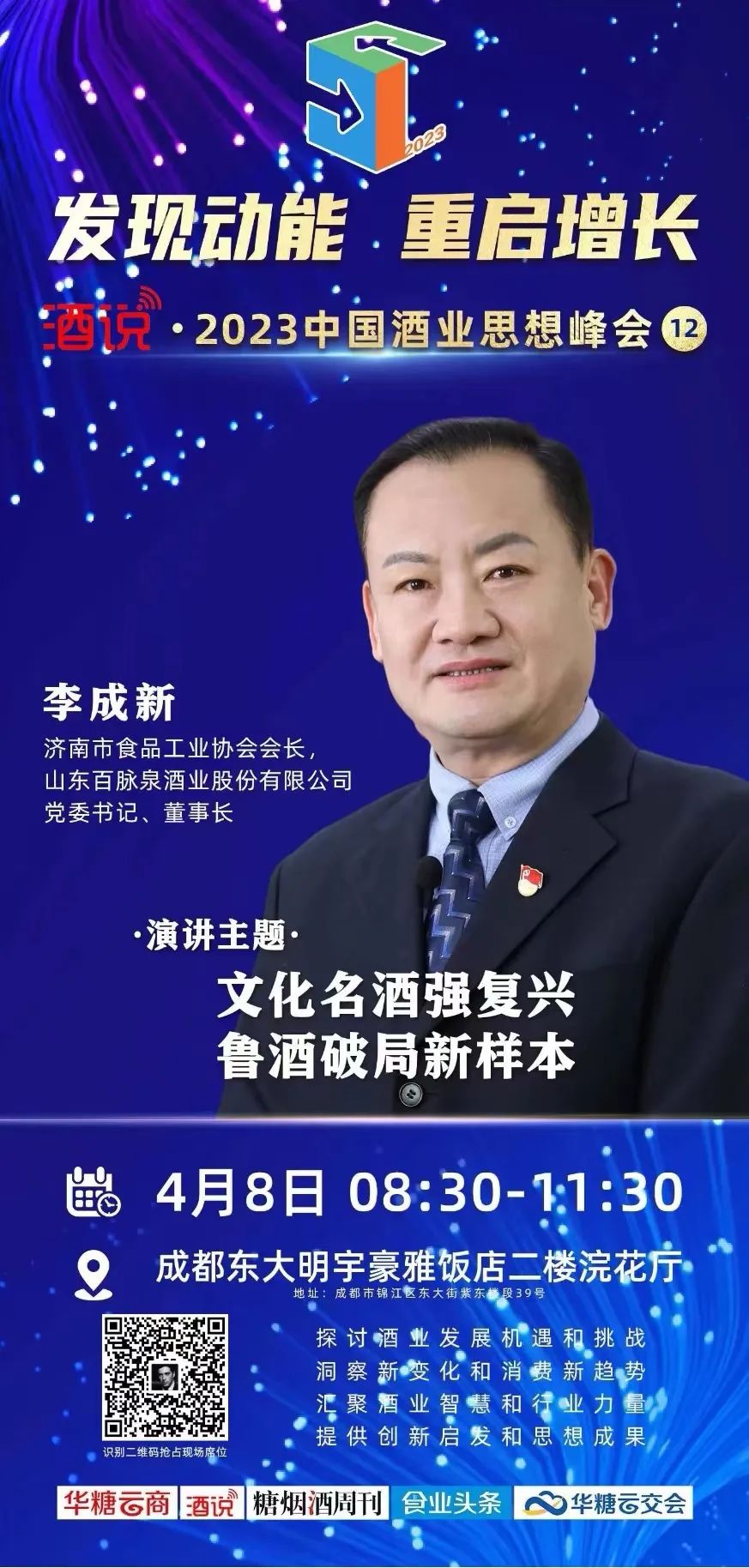 与此同时,百脉泉酒业股份有限公司党委书、董事长李成新先生也将亮相“2023中国酒业思想峰会”,并做主题演讲——《文化名酒强复兴 鲁酒破局新样本》。