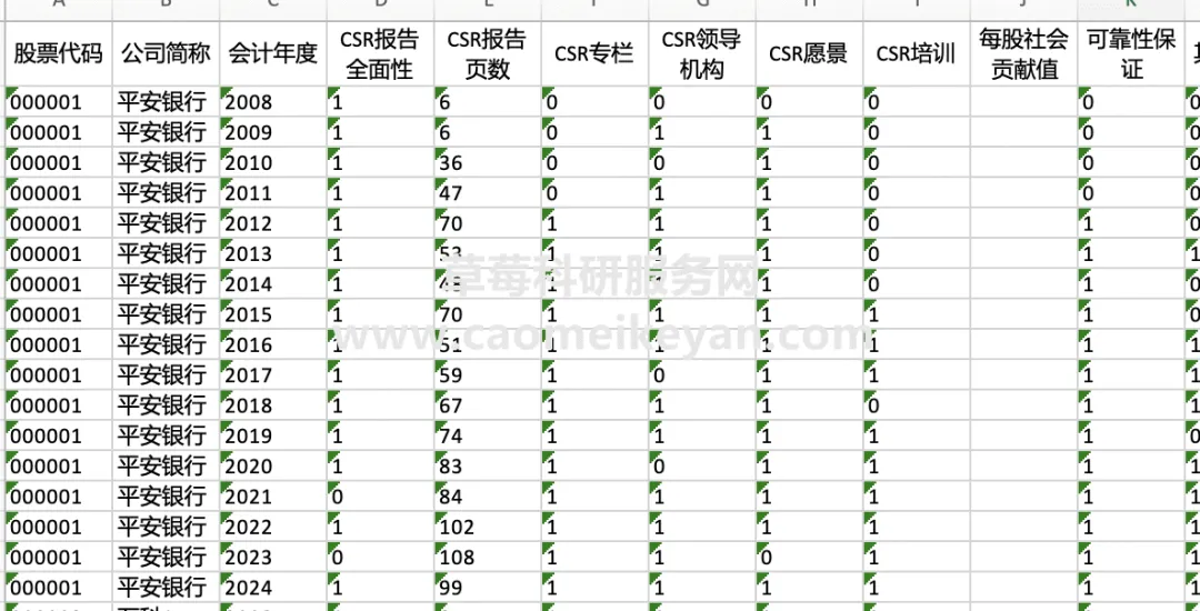 (2)公司治理:股票代码、公司简称 、 会计年度 、CSR报告全面性 、 CSR报告页数 、 CSR专栏 、 CSR领导机构、 CSR愿景 、CSR培训、 每股社会贡献值 可靠性保证、 其他优势 、 会计违规