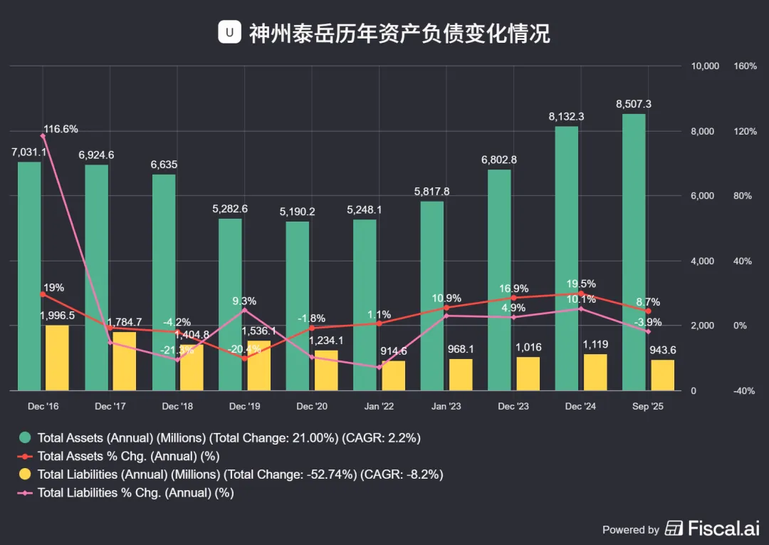 2024年,神州泰岳的总资产为81.32亿元,较上年同期增长19.54%;总负债为11.19亿元,较上年同期增长10.14%;2025年三季报,神州泰岳的总资产为85.07亿元,较上年同期增长8.74%;总负债为9.44亿元,较上年同期下降3.88%。