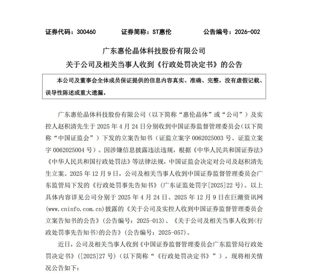 1月12日晚间,广东惠伦晶体科技股份有限公司(以下简称“惠伦晶体”)发布公告称,近日收到广东证监局《行政处罚决定书》,因2020年至2022年期间存在未披露资金占用、年度报告存在虚假记载等信息披露违法违规行为,公司及5名相关责任人被处以罚款,罚款合计共1140万。公告显示,惠伦晶体未按规定披露资金占用事项,2020 年年度报告存在重大遗漏。2020 年,惠伦晶体以采购设备及材料、预付工程款等名义向7 家公司支出款项,并最终划转至控股股东新疆惠伦股权投资合伙企业(有限合伙)及公司实际控制人赵积清本人等关联方银行账户,用于归还新疆惠伦股权质押款及赵积清个人借款,构成关联方对公司的资金占用,2020 年累计发生额为 2833万元。截至2025年3 月,关联方已归还上述占用资金及利息。为掩盖上述资金占用行为,惠伦晶体向供应商支付款项后在公司账面虚构了原材料、固定资产等资产,以结转原材料成本和摊销费用的形式虚增公司 2021 年、2022年成本费用,虚减2021年、2022年利润总额。惠伦晶体披露的2021年年度报告、2022年年度报告存在虚假记载。2021 年、2022 年,惠伦晶体存在虚构采购业务、虚构销售业务以及未按实际情况确认收入等情形,分别虚增营业收入25,489,938.60 元、62,333,644.39 元,占当期披露营业收入的 3.89%、15.79%;2021 年虚增利润总额 8,445,707.65 元、2022 年虚减利润 1,408,939.34 元,分别占当期披露利润总额的 6.13%、0.91%。依据《证券法》第一百九十七条第二款的规定,广东证监局对惠伦晶体责令改正,给予警告,并处以300万元罚款;对惠伦晶体实际控制人赵积清给予警告,并处以400万元罚款,其余4名时任高管分别被处以60万至150万元不等罚款,上述罚款合计1140万元。惠伦晶体表示,将认真吸取经验教训,加强内部治理的规范性,提高信息披露质量,严格遵守相关法律法规规定,真实、准确、完整、及时、公平地履行信息披露义务,维护公司及广大投资者的利益。采写:南都N视频记者 李晓艺
