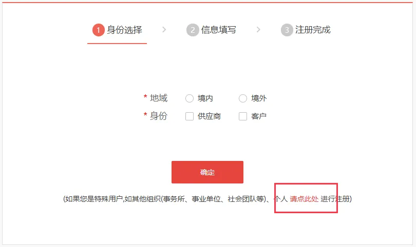 请核对注册企业类型是否正确,事务所、事业单位、社会团队、工会、个人等,请点击红色字体“请点此处”进行注册。