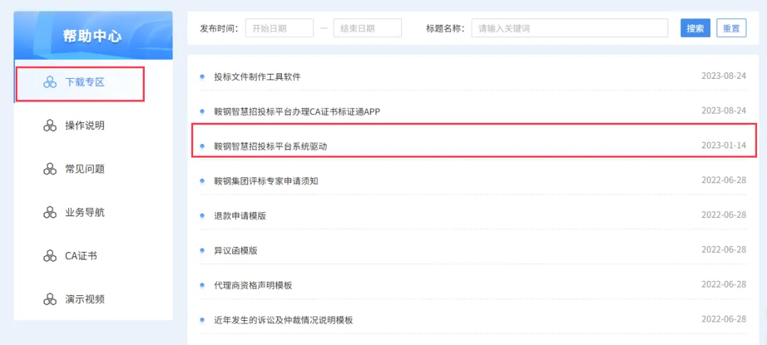 (2)也可以在平台首页末尾下载专区,找到“鞍钢智慧招投标平台系统驱动”,下载安装。