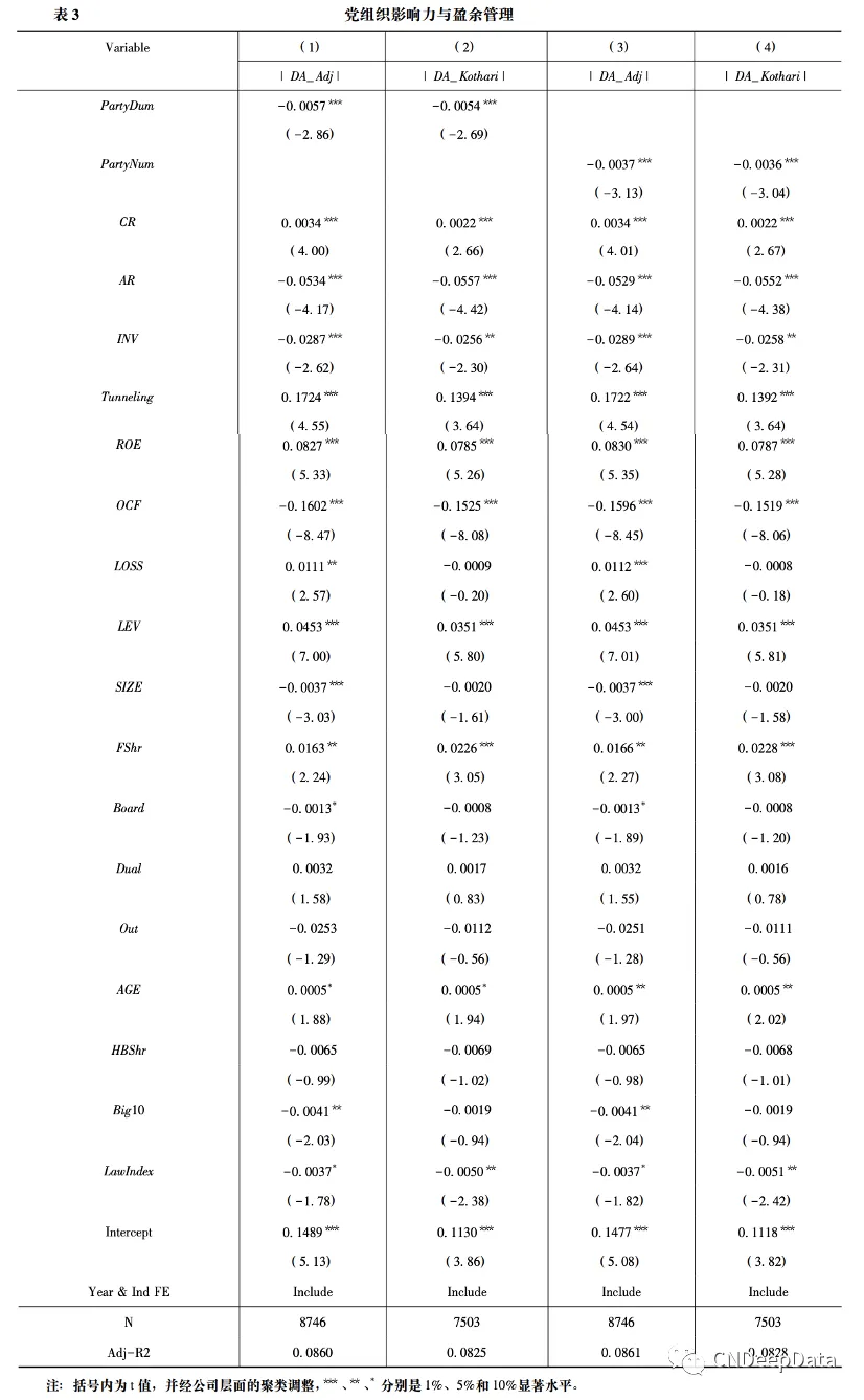 表 3 列示了对研究假说的检验结果。结果显示,党组织是否具有影响力哑变量 (PartyDum) 及影响力程度 ( PartyNum) 均与盈余管理程度 ( | DA_ Adj | 或 | DA_ Kothari | ) 在 1%的显著水平下呈显著负相关的关系。从经济意义上来看,第 1-2 列里可以分别计算出党组织是否具有影响力哑变量 ( PartyDum) 每变动一个标准差,盈余管理程度 ( | DA_ Adj | ) 会降低 ( 0. 0057 × 0. 4540) /0. 0876 × 100% = 3. 40% ( | DA_ Kothari | 降低 ( 0. 0054 × 0. 4540) / 0. 0825×100% = 2. 40%) 。第 3-4 列里可以分别计算出党组织影响力程度 ( PartyNum) 每变动一个标准差,企业盈余管理程度 ( | DA_ Adj | ) 会降低 ( 0. 0037×0. 7760) /0. 0876× 100% = 3. 40% ( | DA_ Kothari | 降低 ( 0. 0036 × 0. 7760) / 0. 0825×100% = 3. 60%) 。以上这些结果说明,与党组织影响力较弱的企业相比较,党组织影响力较强的企业的盈余管理 程度显著更低,且存在显著的经济意义。