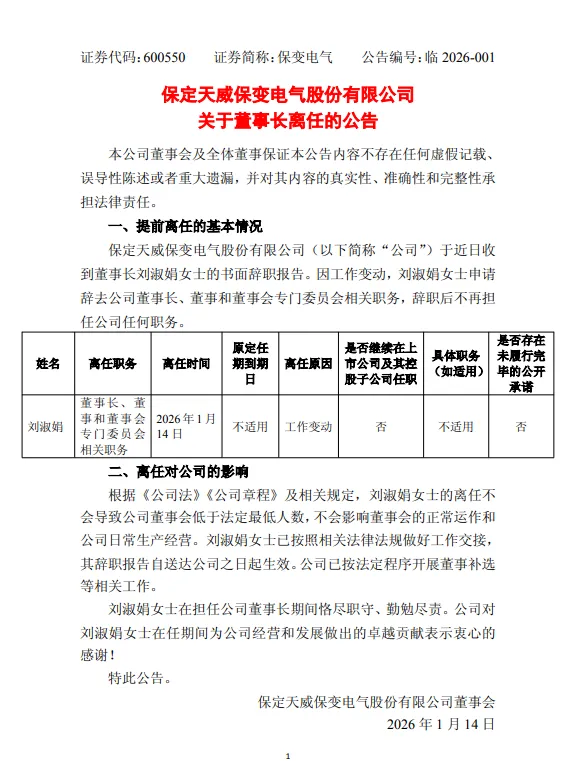 1月14日,保变电气(600550)公告称,公司于近日收到董事长刘淑娟女士的书面辞职报告。因工作变动,刘淑娟女士申请辞去公司董事长、董事和董事会专门委员会相关职务,辞职后不再担任公司任何职务。