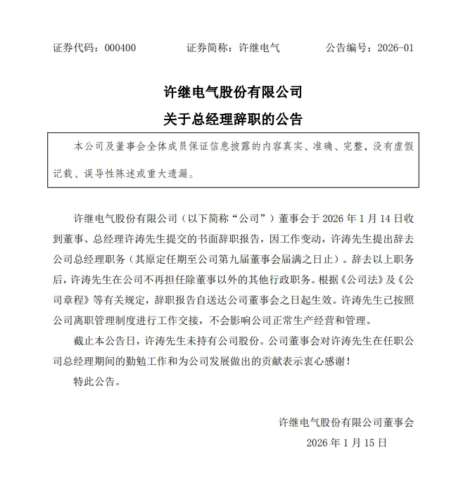 许继电气(000400)公告称,公司董事会于2026年1月14日收到董事、总经理许涛先生提交的书面辞职报告,因工作变动,许涛先生提出辞去公司总经理职务(其原定任期至公司第九届董事会届满之日止)。辞去以上职务后,许涛先生在公司不再担任除董事以外的其他行政职务