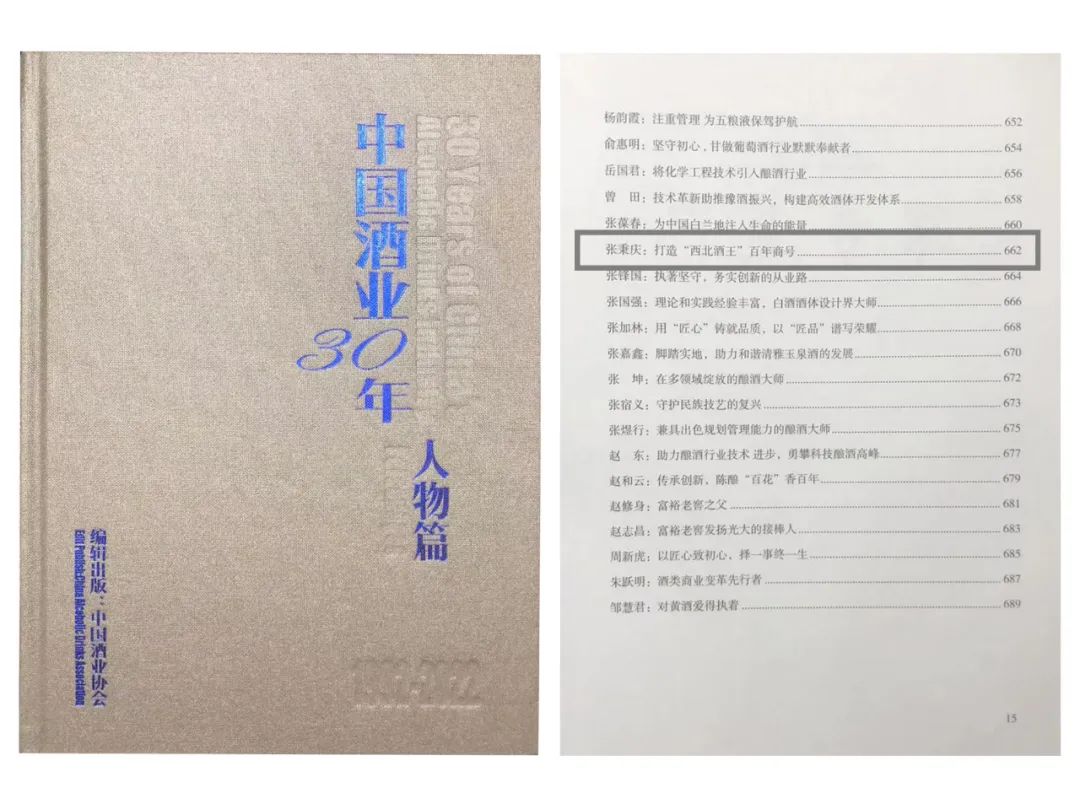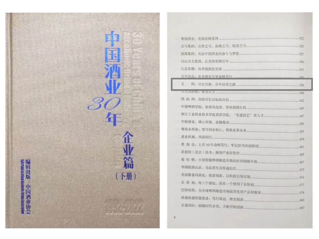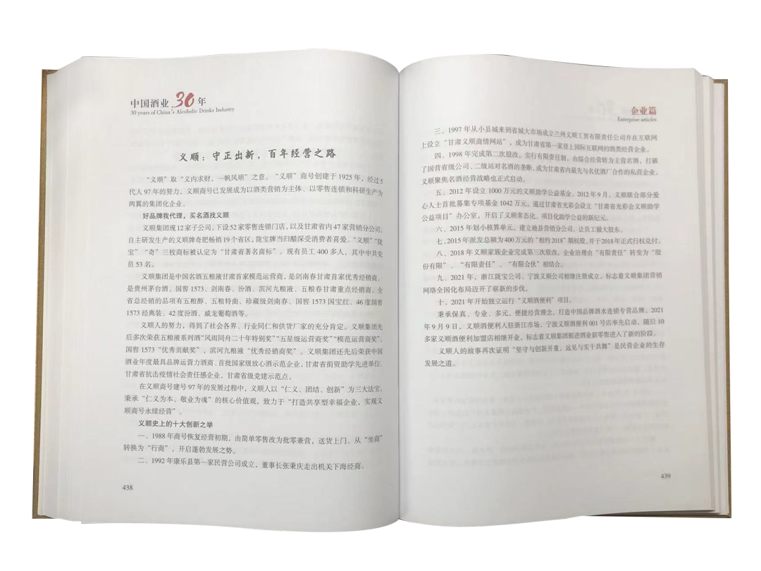《中国酒业30年》全书共六册,包括:《发展篇》、《企业篇》、《人物篇》、《产区篇/产品篇》、《中国酒业协会篇》。其中:甘肃义顺集团入选《中国酒业30年》系列丛书企业篇,义顺集团董事长张秉庆入选《中国酒业30年》系列丛书人物篇。