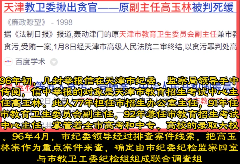 【教育反腐】:长久话题吧,印象最深的是笔者上高中时(93年-96年)就曾在电视上看过"天津市教育卫生委副主任高玉林"的新闻报道(副厅级)。他曾是天津教育卫生委副主任兼天津市教育招生考试中心主任。