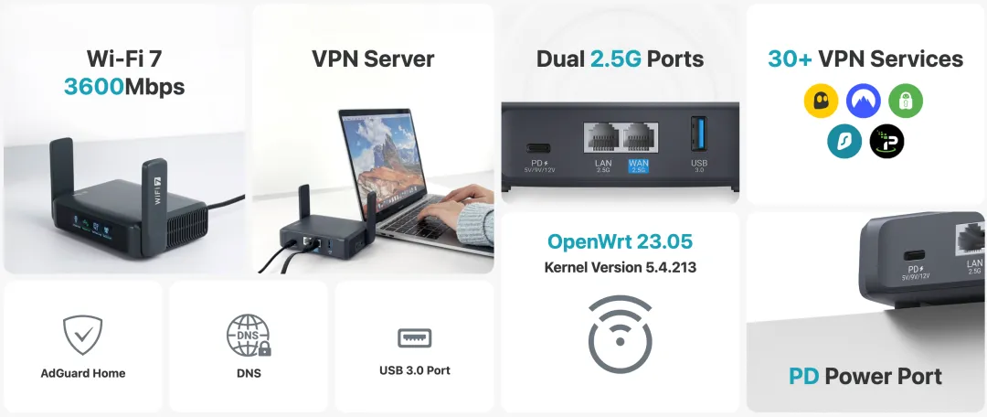 Beryl 7 (GL-MT3600BE) 是一款小巧的双频 Wi-Fi 7 旅行路由器,在 GL.iNet 的旅行路由器产品线中,其 VPN 速度最高可达 1100 Mbps (WiredGuard) 和 1000 Mbps (OpenVPN-DCO),并配备双 2.5G 以太网端口。它兼容通用 USB-C 充电接口,可使用任何标准手机充电线和电源适配器供电。这款路由器可同时支持 120 台以上设备连接,所有功能都集成在一个时尚便携的机身中,专为移动生活而设计。博主曾经也针对此产品做过一系列文章: