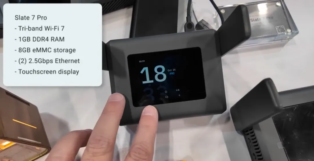 Slate 7 Pro (GL-BE5100) 是全球首款采用可折叠设计和触摸屏的 Wi-Fi 7 旅行路由器,专为追求高速、安全、便携连接的用户打造。这款路由器充分考虑了经常出差旅行的用户,将 Wi-Fi 7 的卓越性能与三个 2.5Gbps 以太网端口相结合,可随时随地提供超高速稳定的连接。其创新的可折叠结构增强了便携性,同时将 2.4 英寸触摸屏放置在便于用户进行直观的设备端管理,并支持多角度查看。Slate 7 Pro 采用开源固件,支持多 WAN、DNS 加密和 VPN,可实现无缝连接和强大的安全性。无论是在商务旅行、度假还是在家,Slate 7 Pro 都将重新定义您的旅行网络体验。该产品本次也拿到了CES创新大奖: