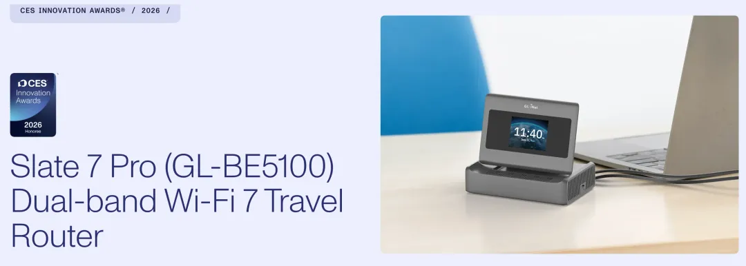 来源:https://www.ces.tech/ces-innovation-awards/2026/slate-7-pro-gl-be5100-dual-band-wi-fi-7-travel-router/