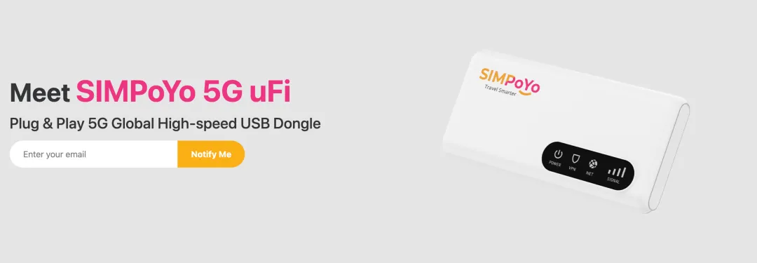 SIMPoYo 5G uFi 是一款小巧的 5G USB 适配器,具备 Wi-Fi 热点功能。它支持全球主要的 5G 和 4G 频段,并内置了 eSIM 和物理 SIM 卡插槽。此外,它还提供一个月的免费 Mullard 虚拟专用网络服务以及 10GB 的美国和欧盟数据流量。