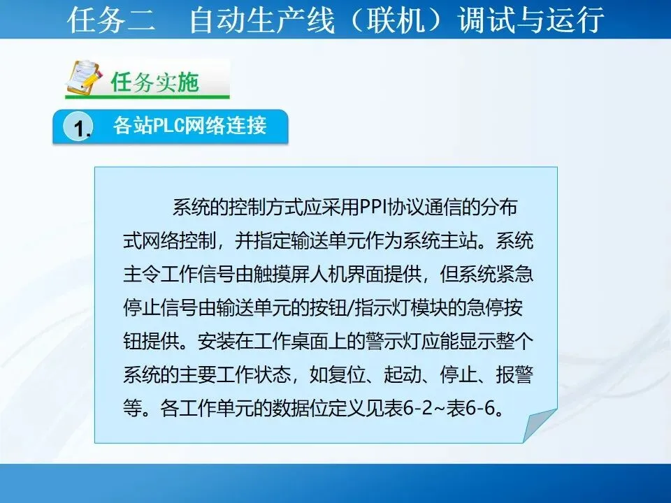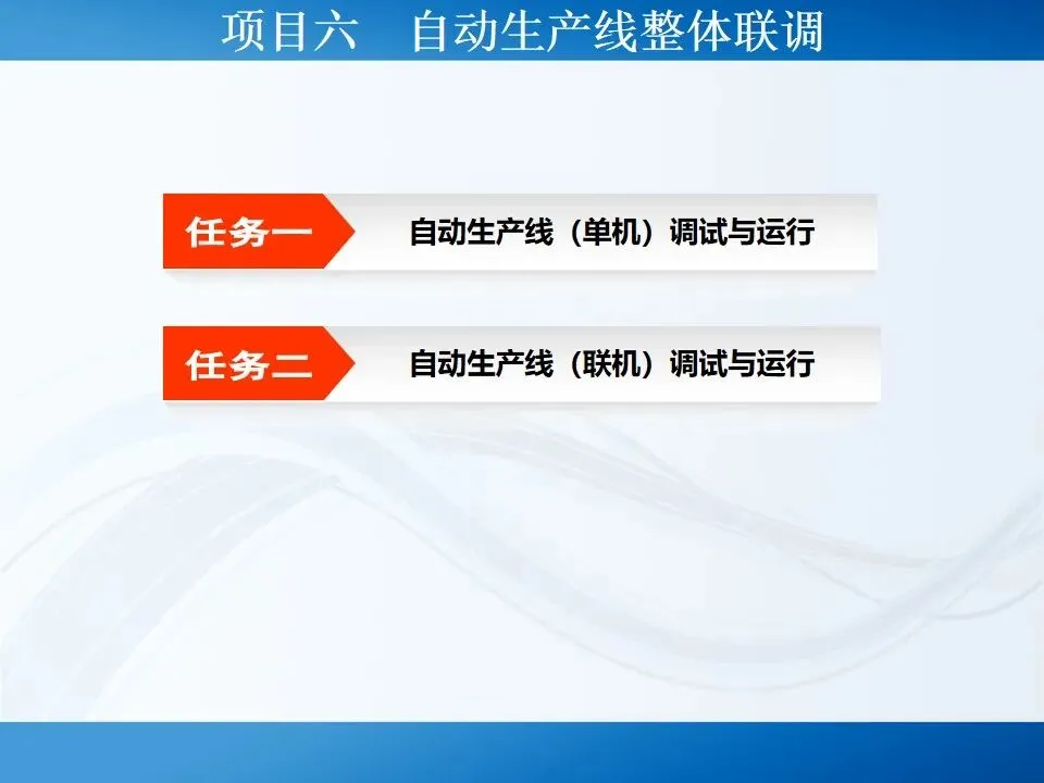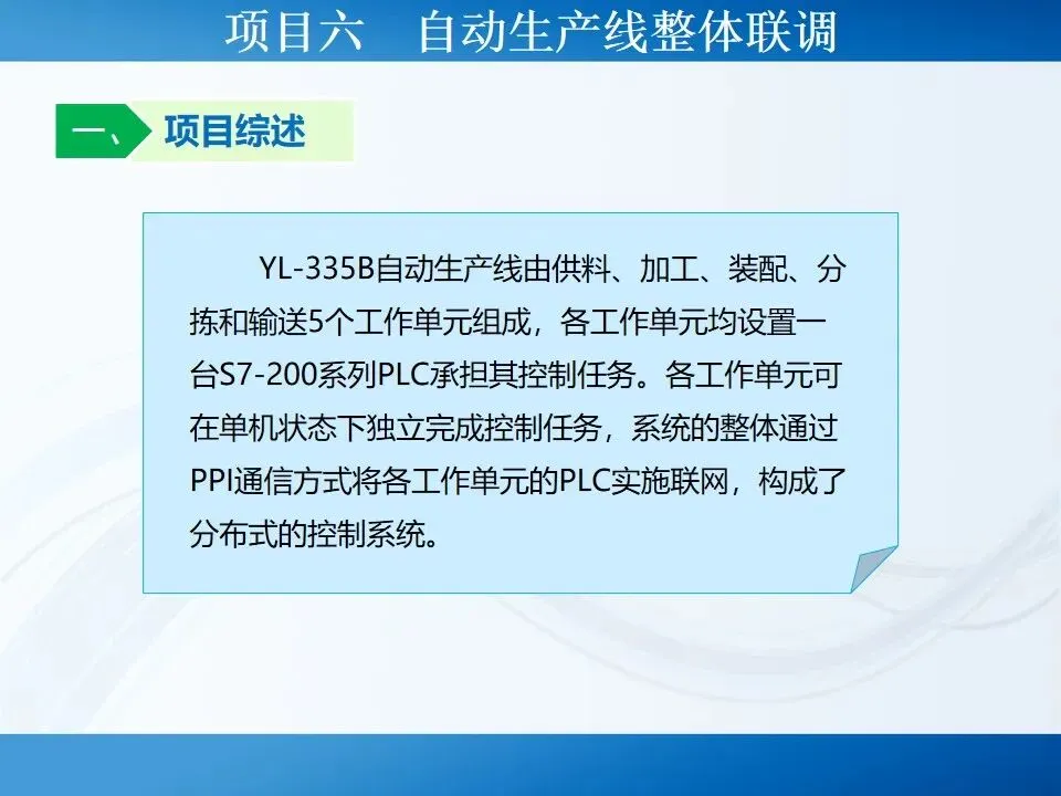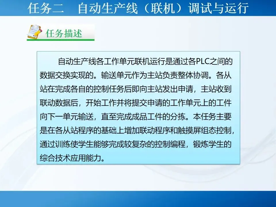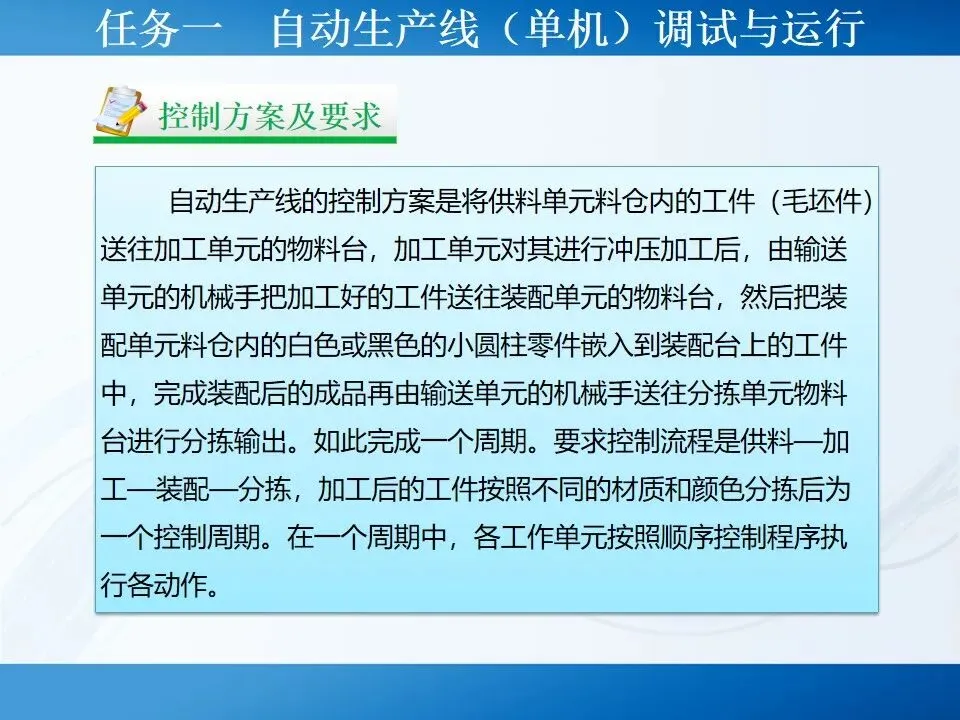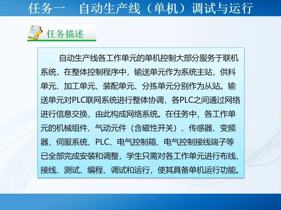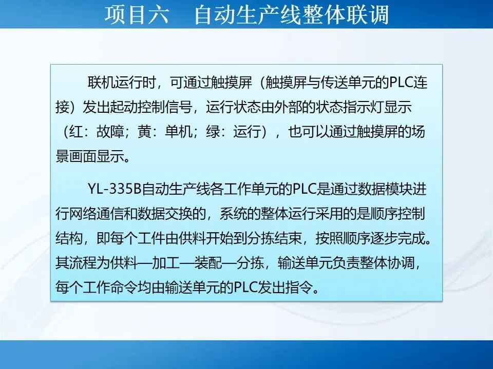 本文系统阐述了自动生产线从单机调试到联机运行的整体控制流程与技术要点。项目以“供料—加工—装配—分拣”为典型工艺流程,通过输送单元作为主站协调各从站(供料、加工、装配、分拣单元)的PLC网络通信,实现顺序控制与数据交换。课件详细说明了单机调试阶段的机电安装、气路电气连接、PLC编程、传感器与变频器设置等基础技能,并重点解析了联机调试中触摸屏人机界面设计、网络状态监控、工作模式切换、报警处理及急停复位等高级控制功能。整体强调了对学生综合技术应用能力的培养,包括系统集成、故障诊断与程序优化,为自动化生产线系统的设计、调试与维护提供了完整的教学与实践框架。