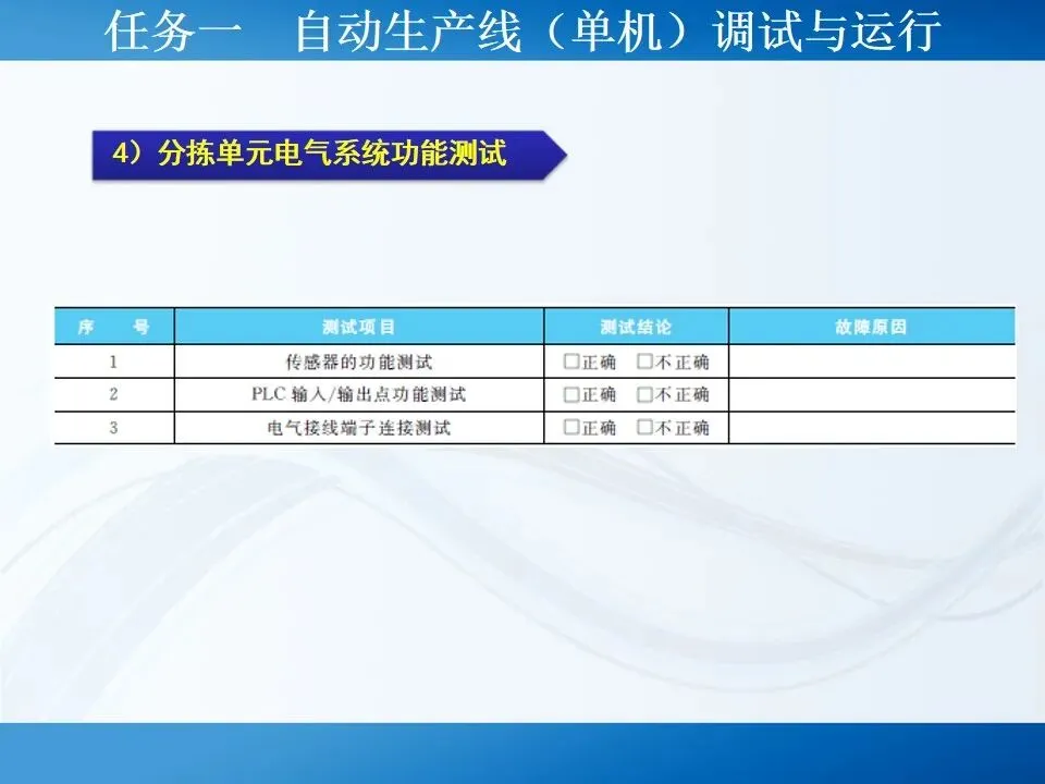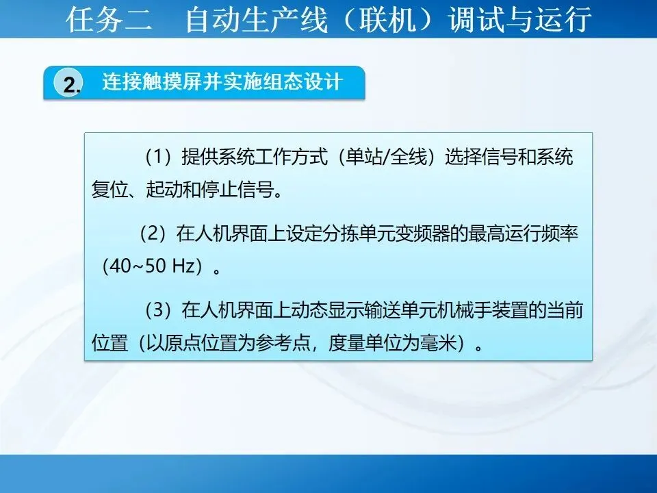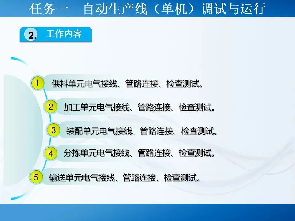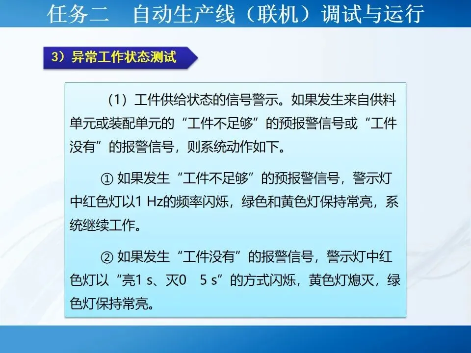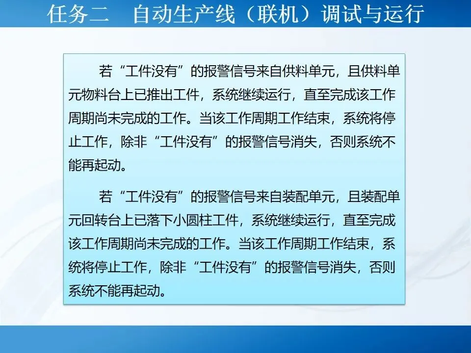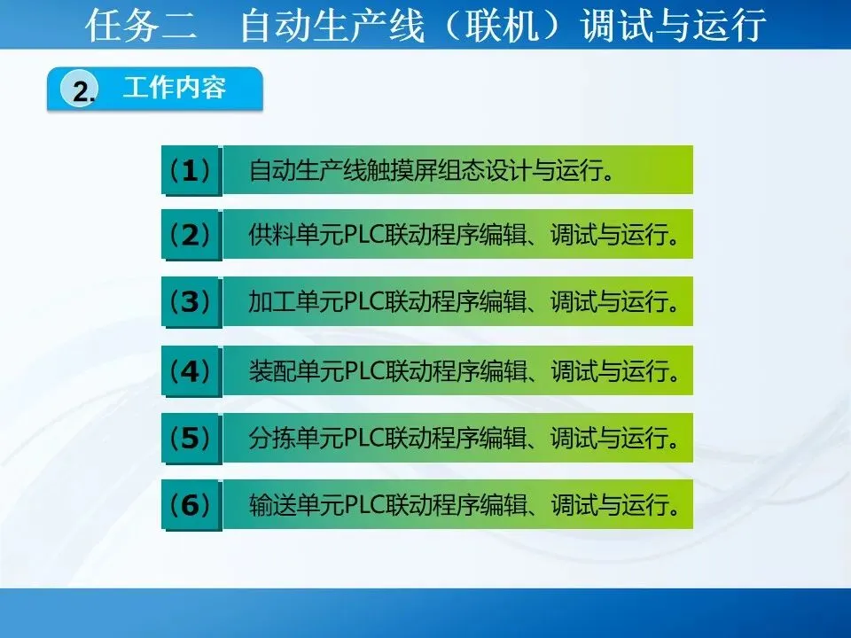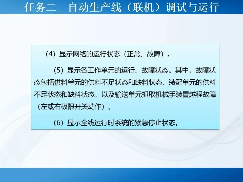本文系统阐述了自动生产线从单机调试到联机运行的整体控制流程与技术要点。项目以“供料—加工—装配—分拣”为典型工艺流程,通过输送单元作为主站协调各从站(供料、加工、装配、分拣单元)的PLC网络通信,实现顺序控制与数据交换。课件详细说明了单机调试阶段的机电安装、气路电气连接、PLC编程、传感器与变频器设置等基础技能,并重点解析了联机调试中触摸屏人机界面设计、网络状态监控、工作模式切换、报警处理及急停复位等高级控制功能。整体强调了对学生综合技术应用能力的培养,包括系统集成、故障诊断与程序优化,为自动化生产线系统的设计、调试与维护提供了完整的教学与实践框架。