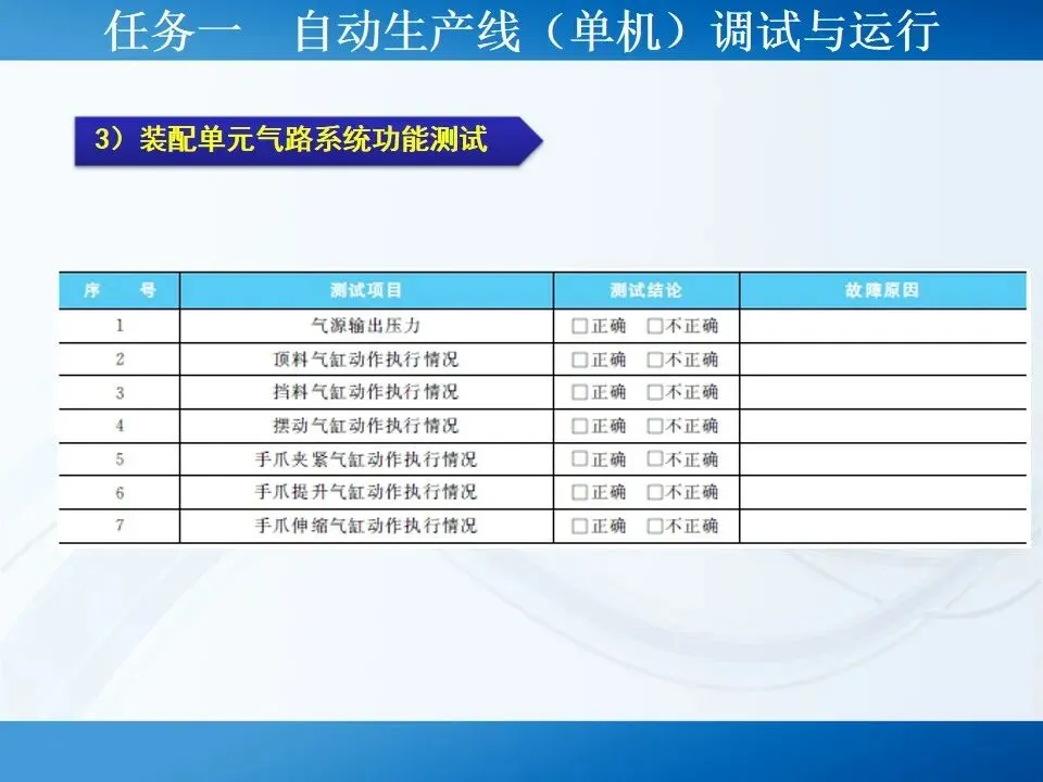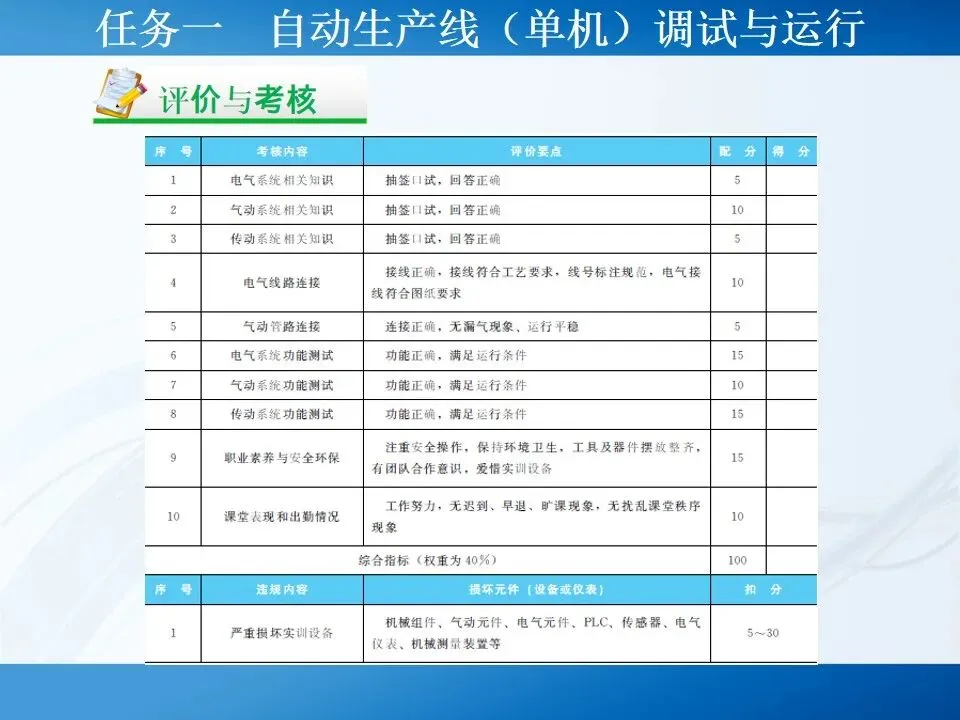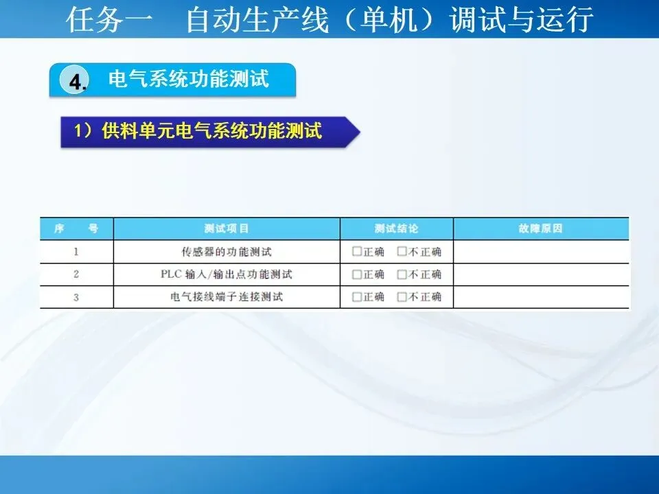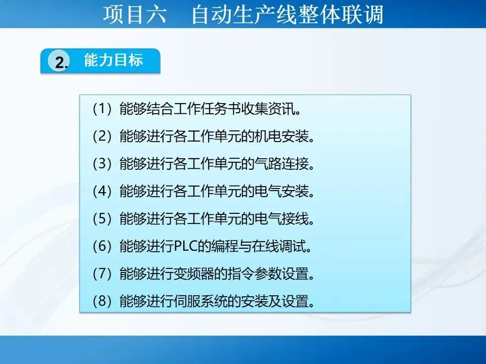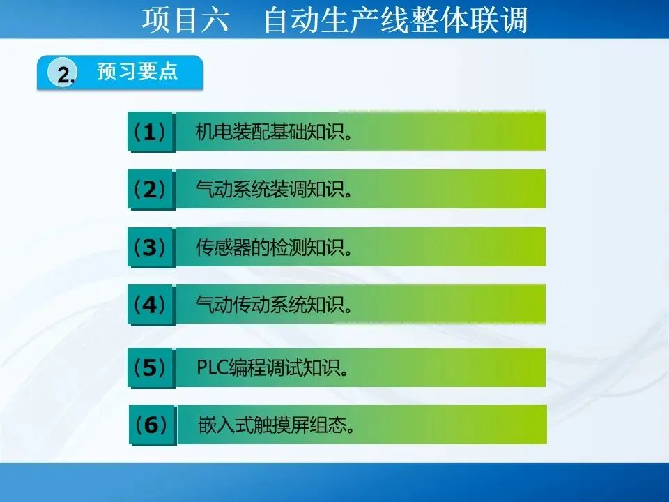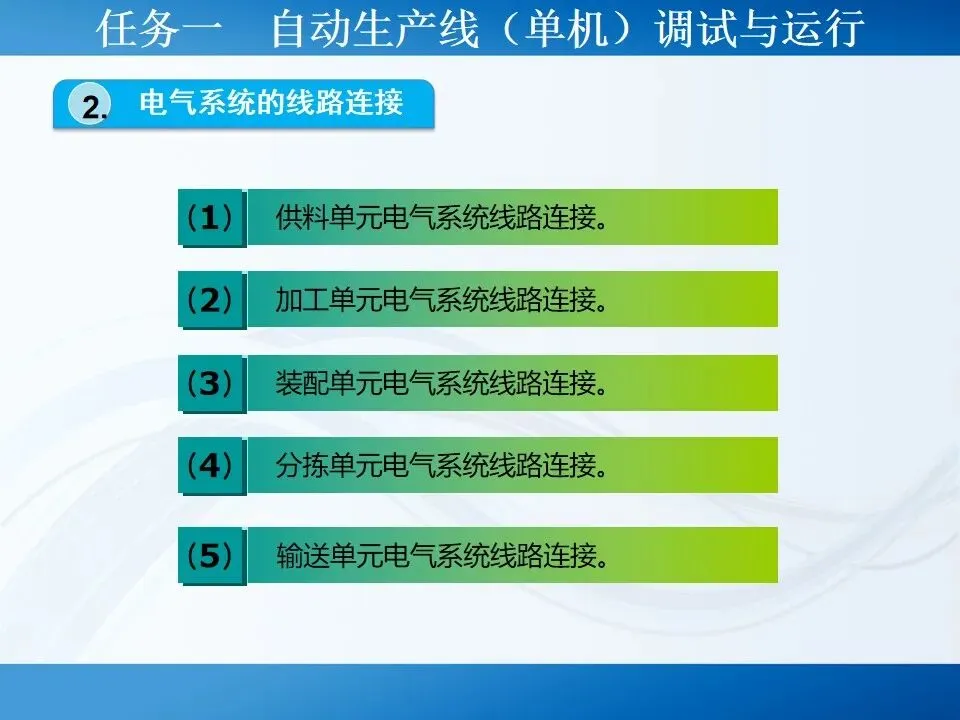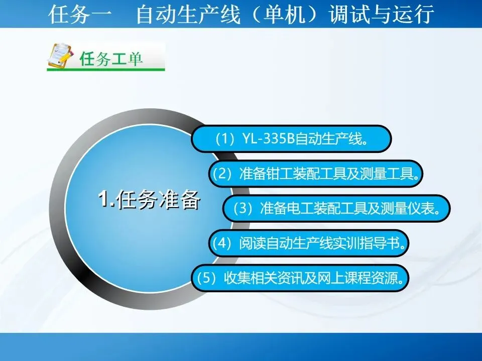 本文系统阐述了自动生产线从单机调试到联机运行的整体控制流程与技术要点。项目以“供料—加工—装配—分拣”为典型工艺流程,通过输送单元作为主站协调各从站(供料、加工、装配、分拣单元)的PLC网络通信,实现顺序控制与数据交换。课件详细说明了单机调试阶段的机电安装、气路电气连接、PLC编程、传感器与变频器设置等基础技能,并重点解析了联机调试中触摸屏人机界面设计、网络状态监控、工作模式切换、报警处理及急停复位等高级控制功能。整体强调了对学生综合技术应用能力的培养,包括系统集成、故障诊断与程序优化,为自动化生产线系统的设计、调试与维护提供了完整的教学与实践框架。