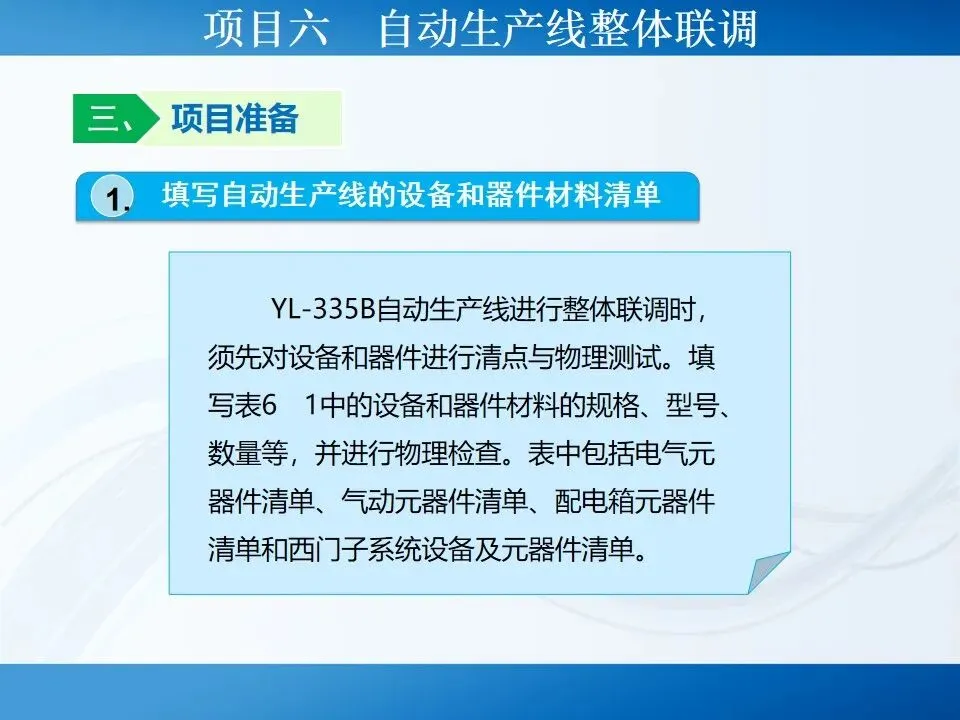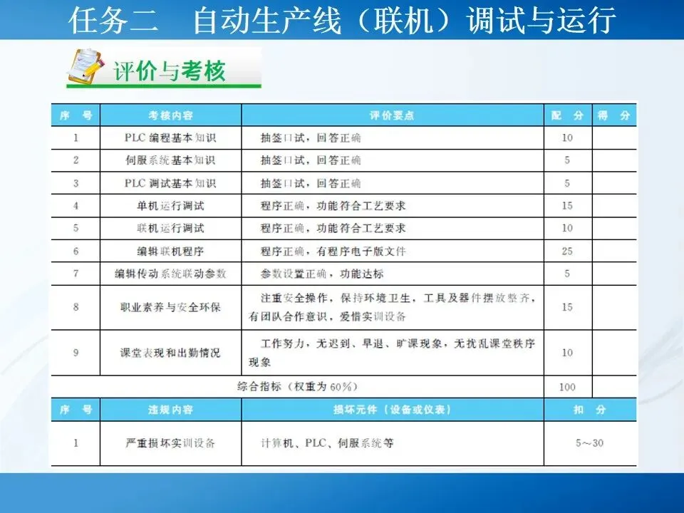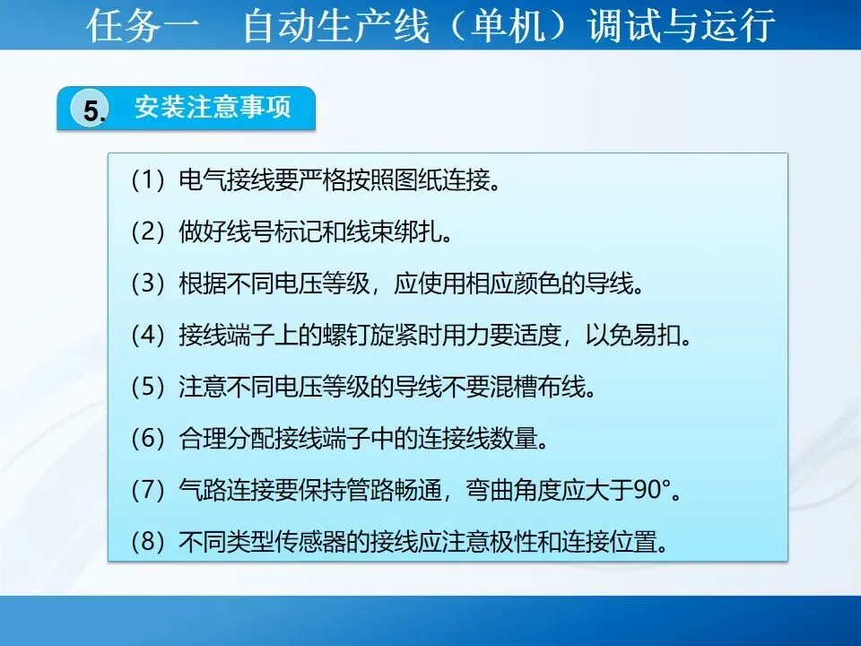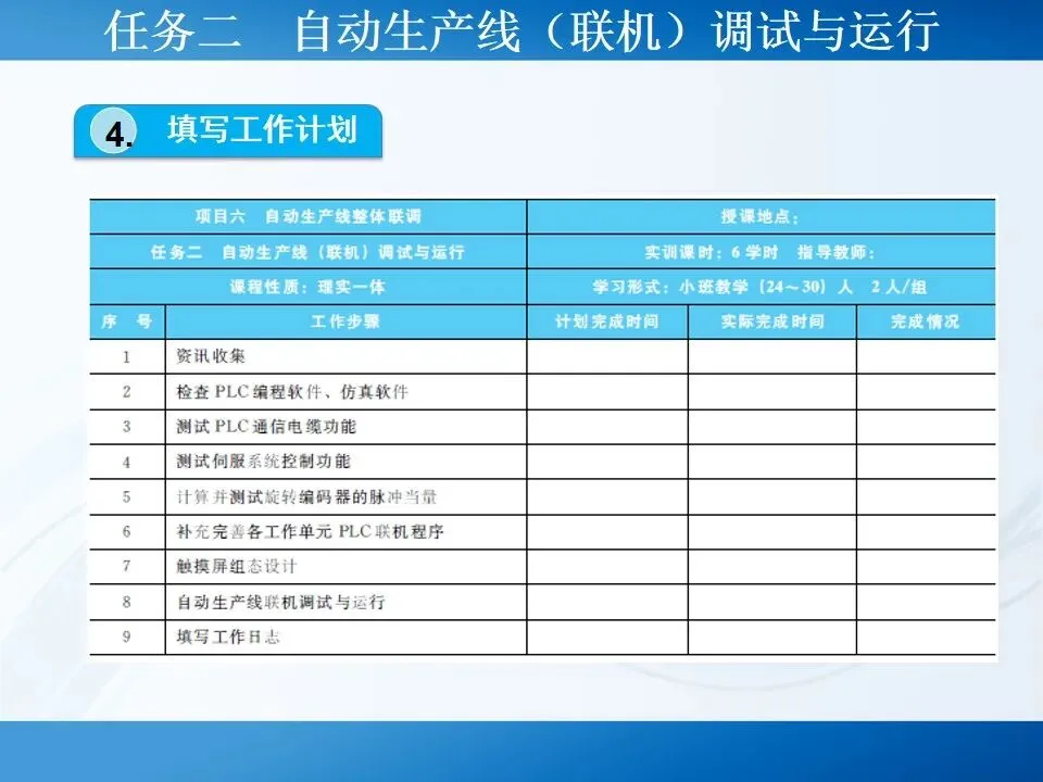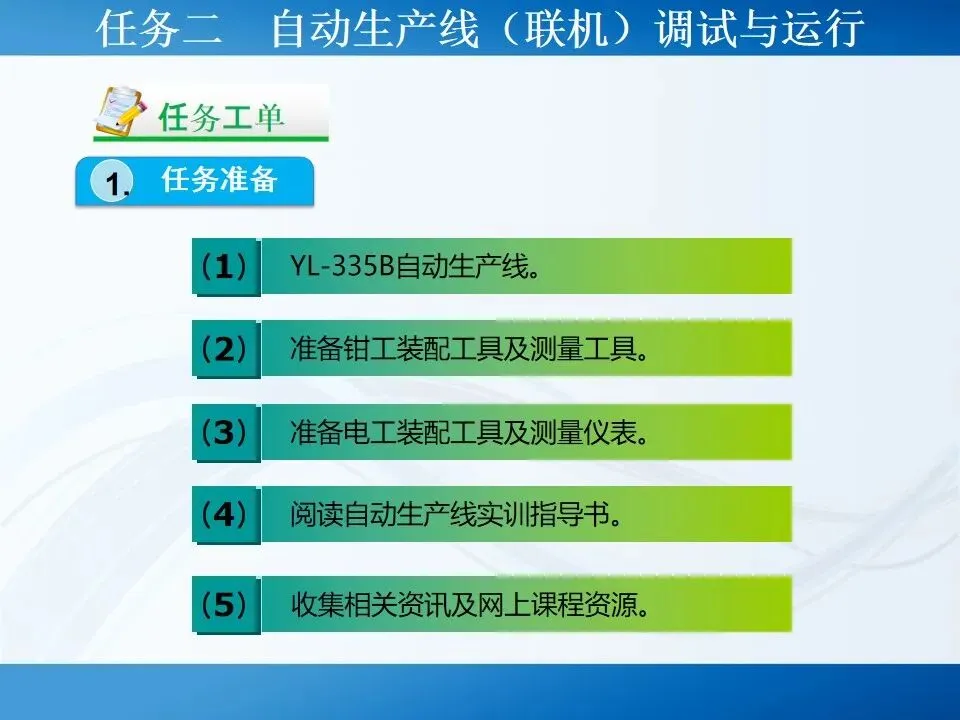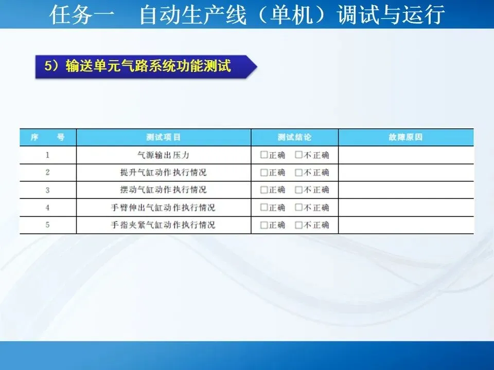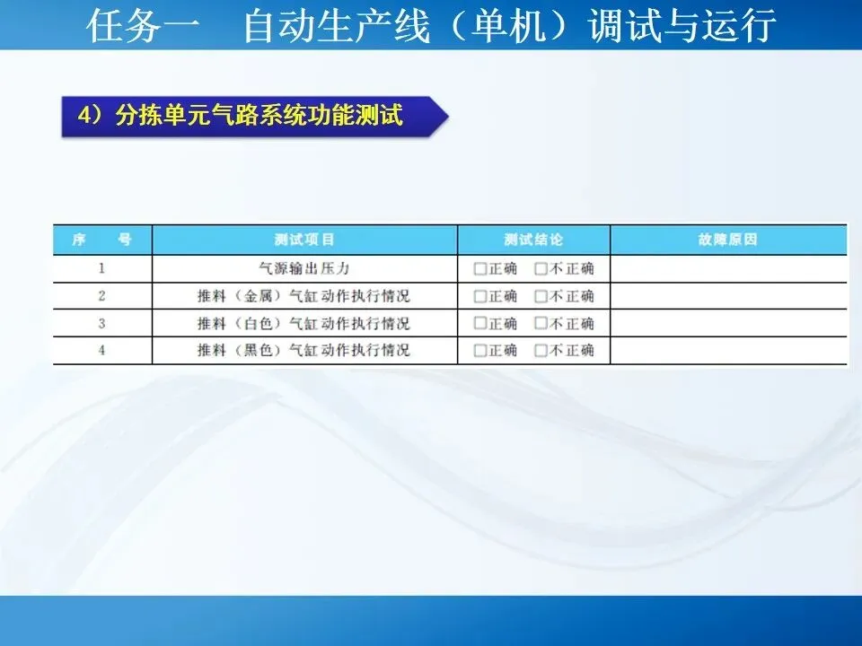 本文系统阐述了自动生产线从单机调试到联机运行的整体控制流程与技术要点。项目以“供料—加工—装配—分拣”为典型工艺流程,通过输送单元作为主站协调各从站(供料、加工、装配、分拣单元)的PLC网络通信,实现顺序控制与数据交换。课件详细说明了单机调试阶段的机电安装、气路电气连接、PLC编程、传感器与变频器设置等基础技能,并重点解析了联机调试中触摸屏人机界面设计、网络状态监控、工作模式切换、报警处理及急停复位等高级控制功能。整体强调了对学生综合技术应用能力的培养,包括系统集成、故障诊断与程序优化,为自动化生产线系统的设计、调试与维护提供了完整的教学与实践框架。