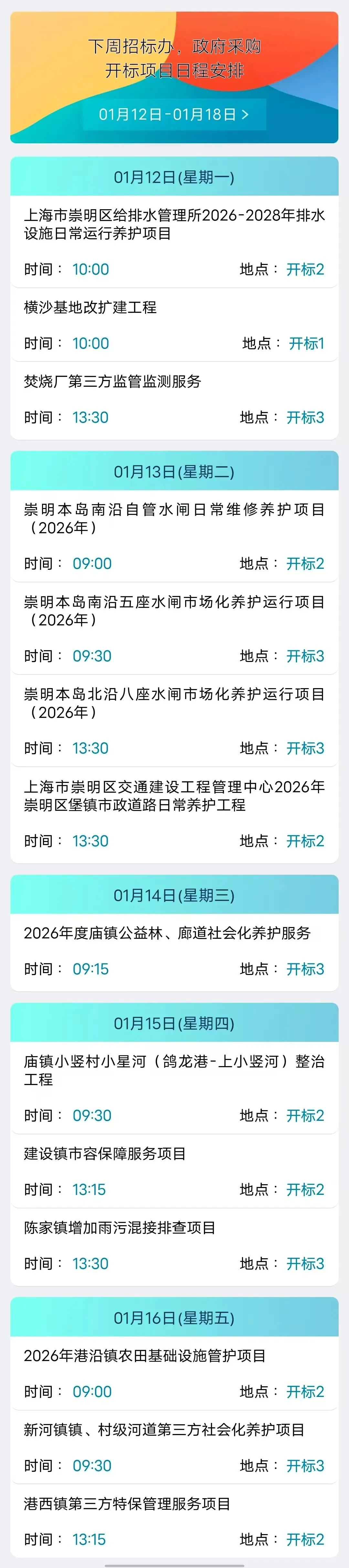 【日程安排】下周招标办、政府采购开标项目日程安排(1月12日-1月18日)
