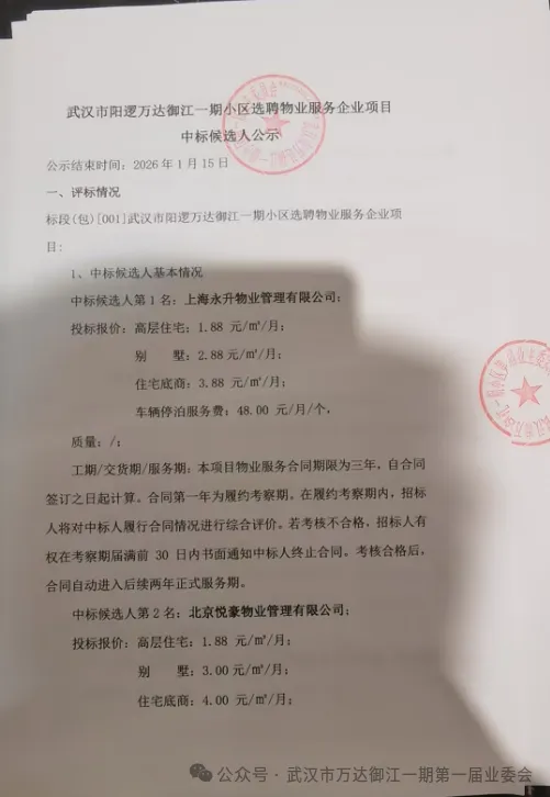 经过查询发现,永升物业公司是大型房地产公司旭辉集团旗下的物业企业。全国性物业服务企业,2024-2025年蝉联“中国物业服务综合实力企业TOP9”。布局全国100座城市,服务超112万户业主,在管面积2.54亿平方米。候选物业公司公示期为2026年1月12日-2026年1月15日。公示期结束后,业委会将尽快组织候选公司与广大业主进行现场见面沟通会,由公司代表详细介绍服务方案并现场答疑。