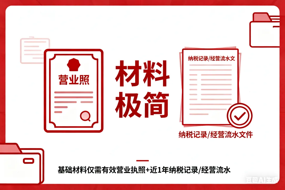 材料极简: 基础材料仅需有效营业执照 + 近1年纳税记录/经营流水;