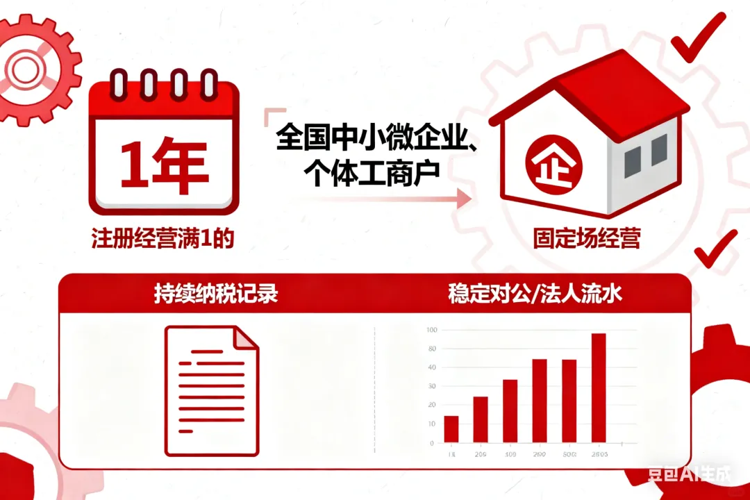 适用企业: 注册经营满1年,有固定场所,具备持续纳税或稳定对公/法人流水的全国中小微企业、个体工商户。