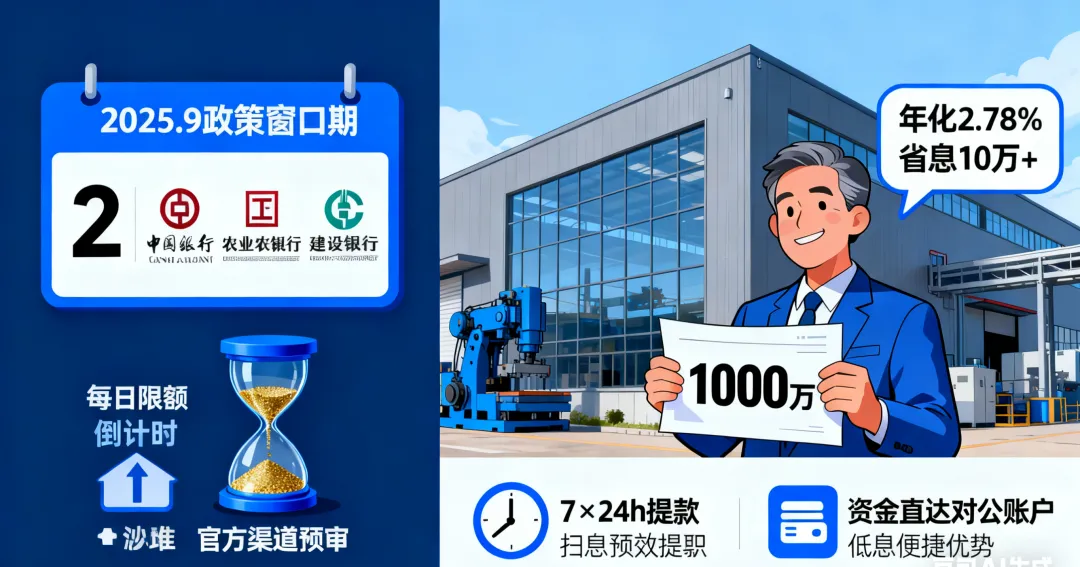 当前政策窗口期仅限2025年9月,四大行每日限额放款,名额先到先得!企业主可通过官方渠道扫码预审,专属客户经理1对1匹配融资方案,7×24小时自主提款,资金直达对公账户。