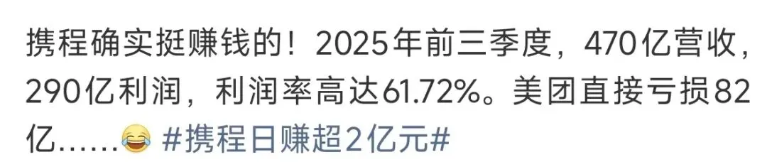 一边是平台赚得盆满钵满:2025年第三季度,携程单季净利润高达199亿元,毛利率超81%,比茅台还高。