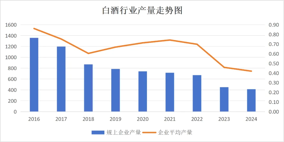 从2016年以来白酒产量下降,但规上企业也在不断减少,要合理的看产量下降的速度应该看单位企业平均产量=总产量/规上企业数量来判断。否则就会判断失真。