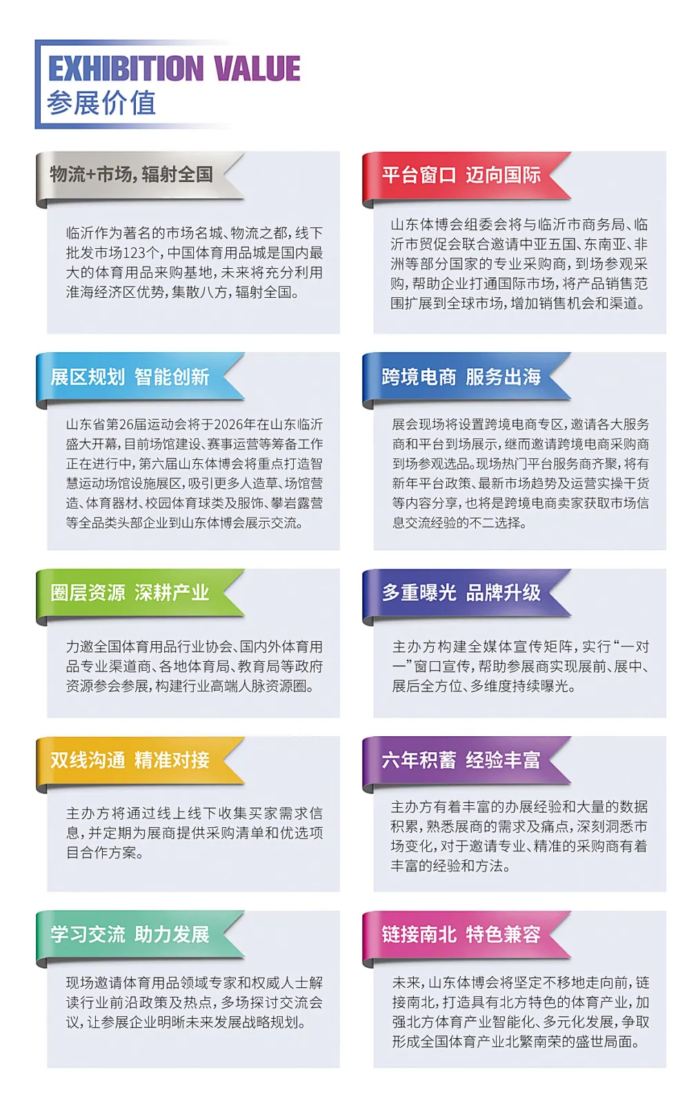 山东体博会作为由山东省体育局、临沂市人民政府联合主办,临沂市体育局、临沂市商务局、兰山区人民政府共同承办的行业展会,山东体博会已成功举办六届,累计服务超2000 家参展企业,吸引超15万人次专业观众。