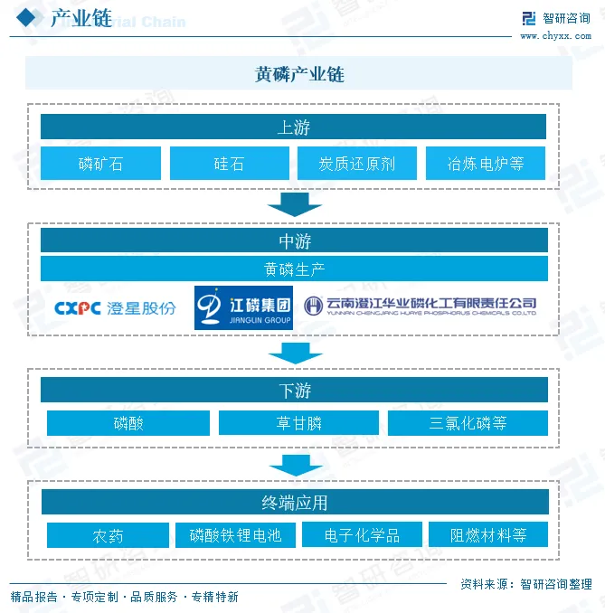 从产业链来看,上游为生产黄磷所需原材料及生产设备,原材料包括磷矿石、硅石、炭质还原剂等,核心设备为冶炼电炉。中游为黄磷生产。下游为黄磷应用领域,黄磷通过衍生转化可形成磷酸、三氯化磷等关键中间体,广泛支撑化肥农药、阻燃材料、电子化学品及磷酸铁锂(LFP)电池等多领域发展,直接关联农业生产安全、工业制造升级与新能源产业布局,其产业发展质量对全球产业链供应链稳定具有重要影响。