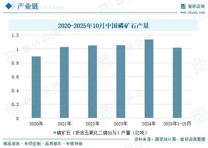 磷矿石是生产黄磷的主要原材料,资料显示,每生产 1 吨电炉法黄磷,大约需要消耗 10 吨磷矿石、2 吨焦炭、2 吨硅石、耗电量 13,000-15,000 kWh,产生尾气2,500-3,000 立方米。我国磷矿石供应充足,为黄磷生产提供了丰富的原料。2021-2025年期间,我国磷矿石(折含五氧化二磷30%)产量维持在1亿吨以上,且整体呈增长态势。2025年1-10月我国磷矿石(折含五氧化二磷30%)产量达1.02亿吨,同比增长9.4%。