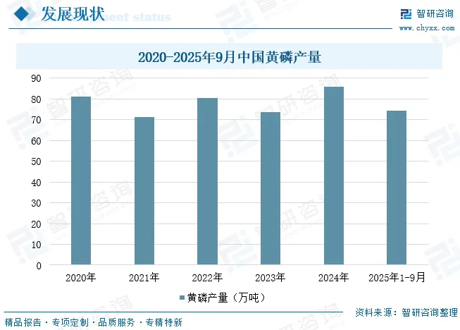 自改革开放以来,我国黄磷产业取得了举世瞩目的发展,2014年我国黄磷产能达到240万吨,产量首次突破百万吨大关,达102.5万吨。近年来各级政府陆续出台了黄磷相关环保政策,进而导致中国黄磷产量自2016年起开始大幅下降。2020-2025年期间,受环保政策不断收紧等因素影响,中国黄磷产量呈波动态势,2024年为期间最高值,达85.71万吨,同比增长16.5%;2025年1-9月黄磷产量为74.15万吨,预计全年黄磷产量为95万吨左右。