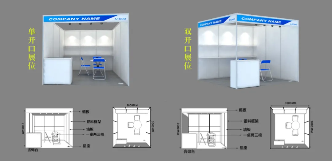 展位规格:长3m,宽3m,高2.5m