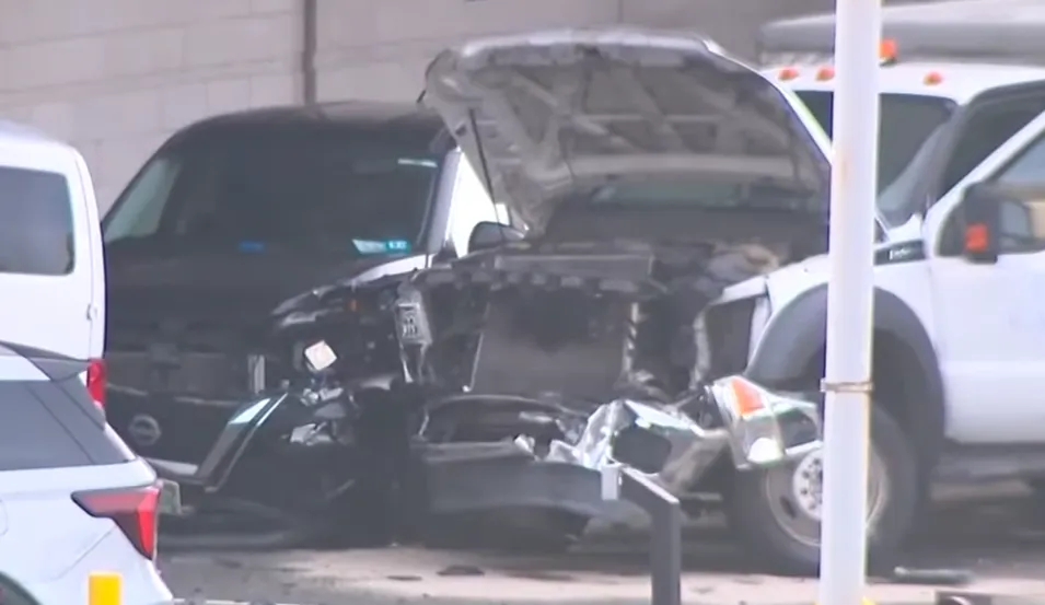 现场视频显示至少有两辆车受损,包括一辆黑色日产奇骏(Nissan Rogue)和一辆餐饮配送车。