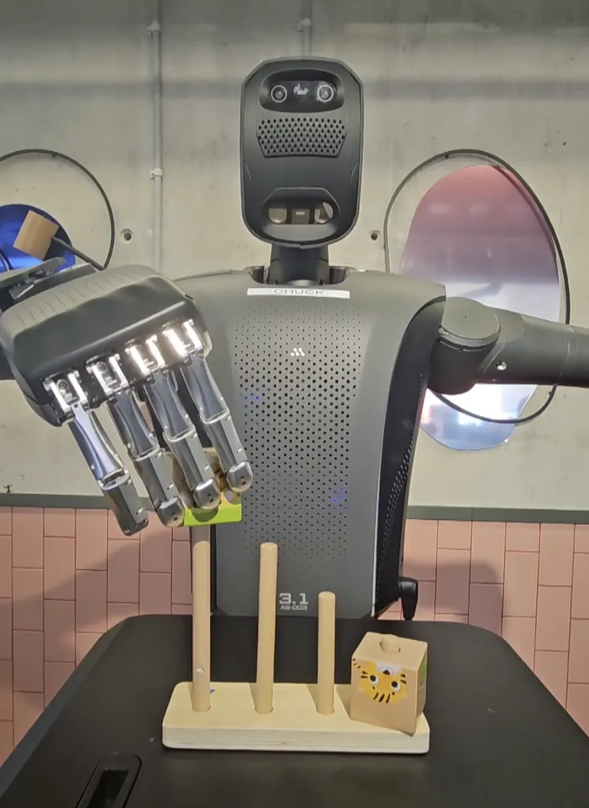在执行层面,机器人配备了多组力触觉点阵的灵巧手,通过触觉反馈来弥补视觉盲区,凭借0.1mm操作精度完成拆包、折叠等柔性动作,再配合快慢双系统架构,能够拆解复杂抽象任务,保障了长程任务的流畅执行与类人的精准操作。