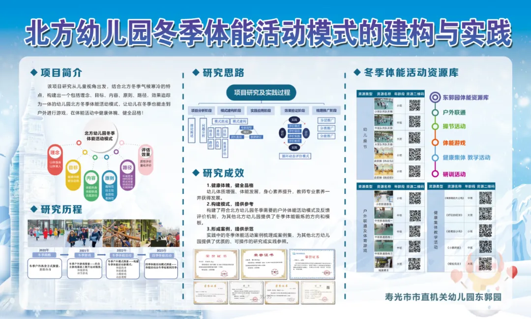 《北方幼儿园冬季体能活动模式的建构与实践》项目作为省基础教育教学改革项目寿光市两个项目之一,于11月22日入选。幼儿园自2018年研究自主游戏,2020年1月,正式开始对冬季体能活动进行研究,已有4年的研究历程。项目研究从儿童视角出发,结合北方冬季气候寒冷的特点,构建出包括理念、目标、内容、原则、路径、效果追踪为一体的幼儿园北方冬季体能活动模式,让幼儿在冬季也能走到户外进行游戏,在体能活动中健康体魄、健全品格。项目研究已初步探索出“冬季体能活动模式、体能活动动作模式清单、冬季体能活动流程清单、冬季体能活动资源库、循环动态评价体系”系列研究成果,获得省市级多项荣誉,并在全国、省级平台进行经验分享。截至目前,东郭园的冬季体能活动模式已在寿光市26处园所进行推广运用,7805名幼儿感受到冬季体能活动的魅力。