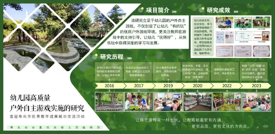《幼儿园高质量户外自主游戏实施的研究》项目研究历时8年,立足于幼儿园的户外自主游戏,遵循自然、生态、野趣的原则,将教育目标蕴含于环境中,创设了丰富、多元的5大类26个游戏区。并在游戏区中投放丰富的玩具材料,总结材料投放的“四置原则”,建立材料广场,让材料引发幼儿游戏、丰富游戏、提升游戏,为幼儿创设“有得玩”的优质户外游戏环境。