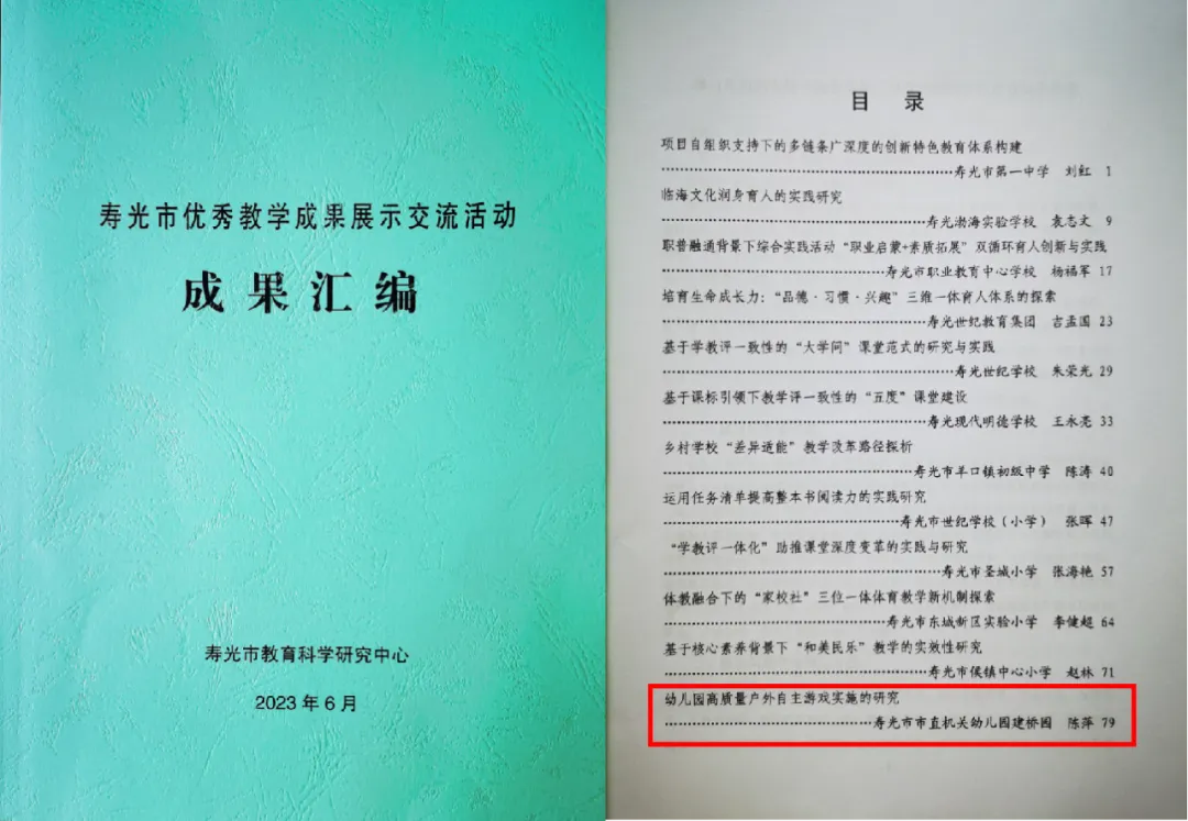 12月27日,寿光市教体局举办“寿光市优秀教学成果推介会暨教科研工作经验交流会议”,市直机关幼儿园东郭园对《北方幼儿园冬季体能活动模式的建构与实践》项目进行了现场经验分享,建桥园《幼儿园高质量户外自主游戏实施的研究》纳入了寿光市优秀教育成果展示交流活动成果汇编。
