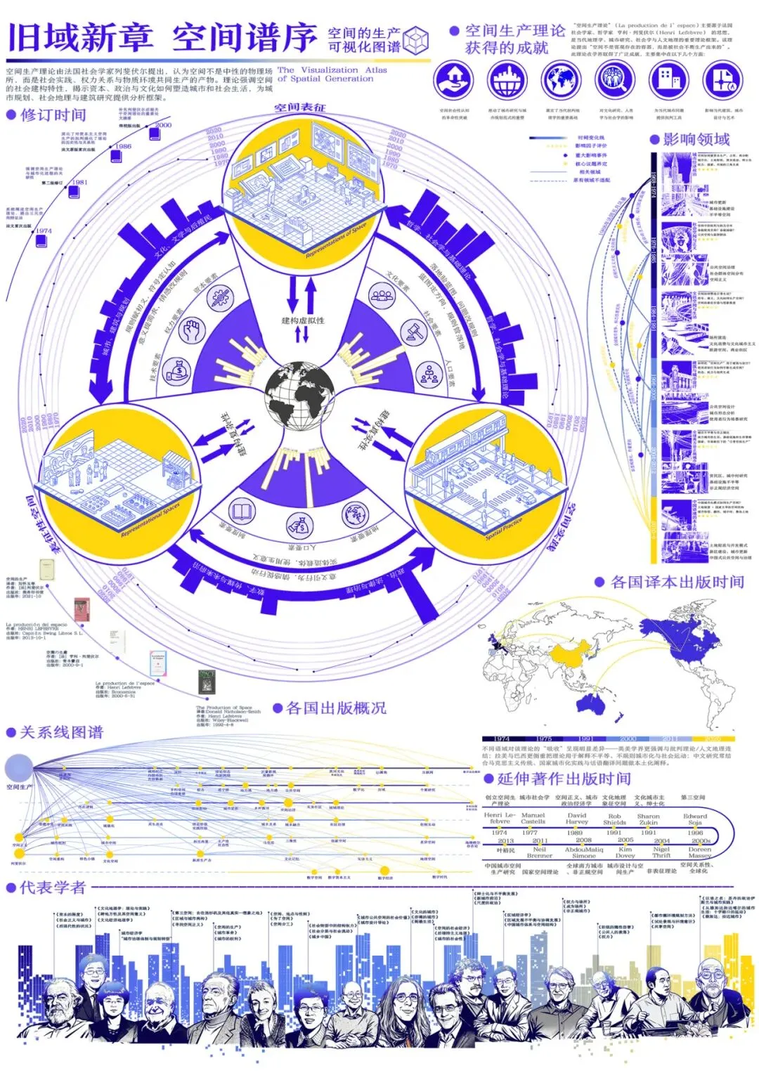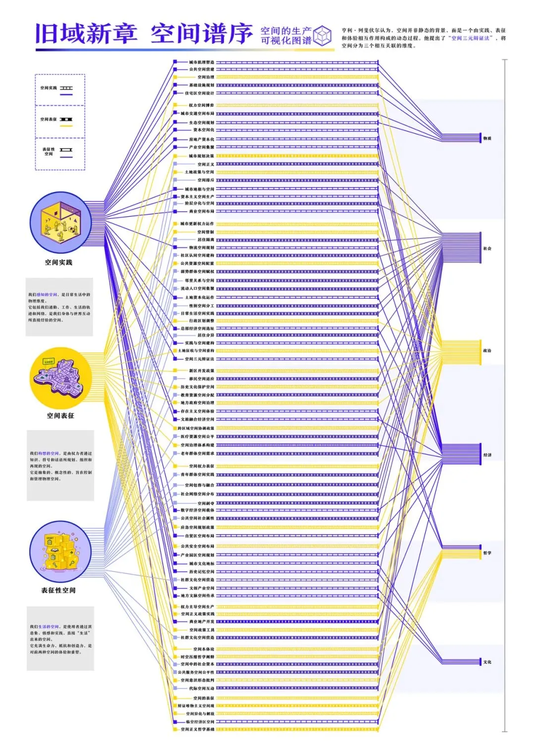 本设计以亨利・列斐伏尔 “空间生产” 理论为核心锚点,聚焦其 “空间是社会关系产物” 的核心命题,将空间三元论、发展脉络、学术网络、实践影响与中国案例进行可视化设计,消解其抽象性强、学术门槛高的传播痛点。