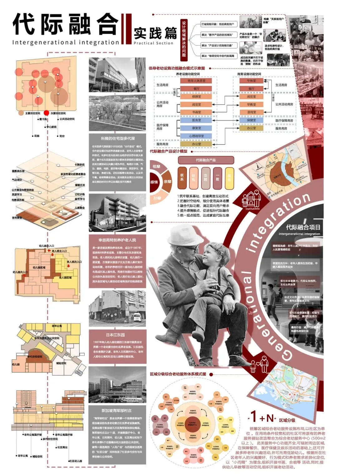 本设计围绕“代际融合理论”,系统呈现该理论的内涵、框架与现实关联。以代际融合典型案例为锚点,通过清晰的视觉语言深描代际融合在空间设计中的应用场景,探索代际融合异向的空间规划、产品设计研究与落地路径。
