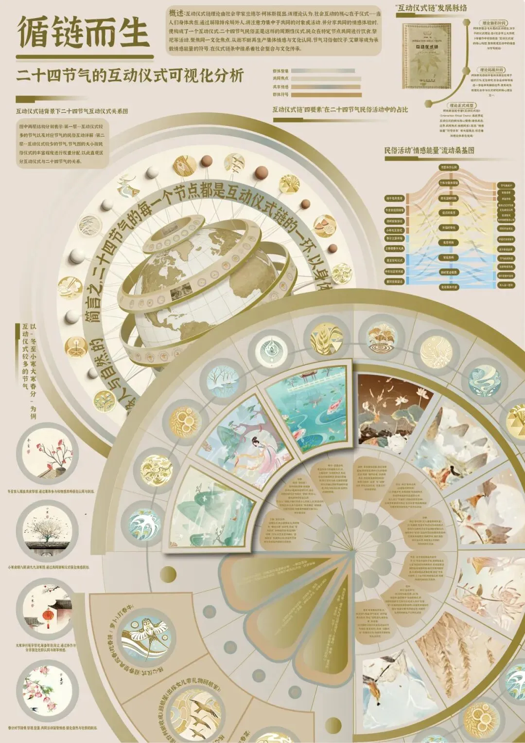《循链而生》基于柯林斯“互动仪式链”理论,将二十四节气民俗解构为“仪式节点-情感联结-文化延续”系统,通过可视化呈现其“共同关注、情感共享、符号传递”的仪式本质,实现节气文化从“经验性习俗”向“可感知仪式链”的学术转化与视觉表达。