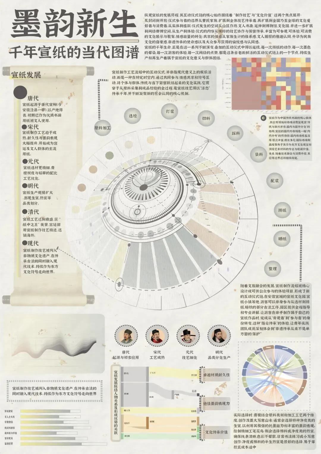《墨韵新生》以互动仪式链理论为解释框架,梳理、串联宣纸的千年传承与当代创新,通过可视化图谱呈现其从传统工艺底蕴到当代价值延伸的仪式化焕新。